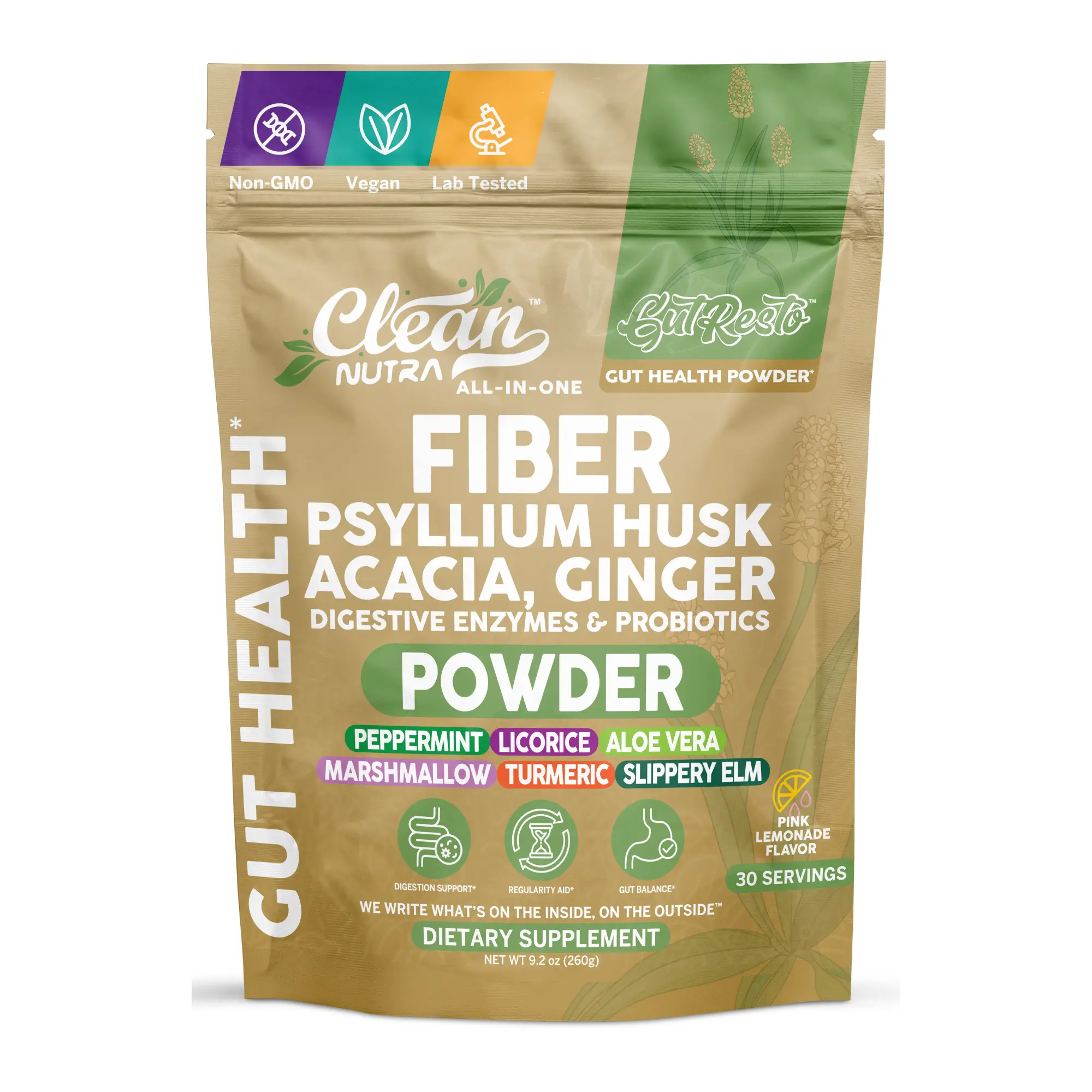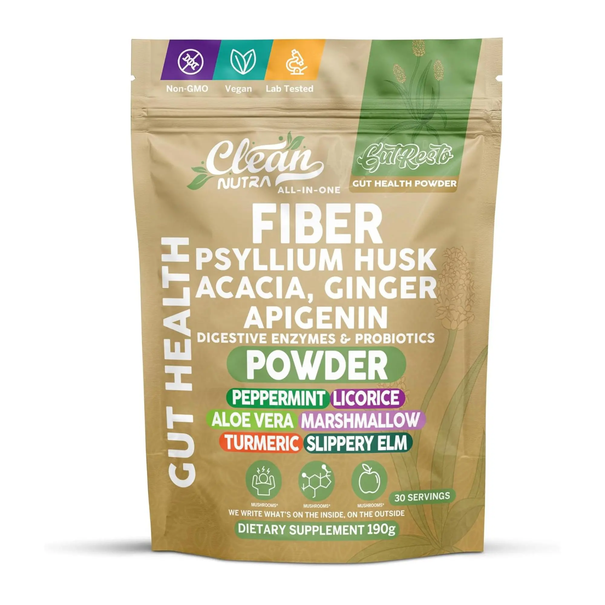 Formulated with psyllium husk, acacia, ginger, and apigenin alongside probiotics and soothing herbs like peppermint, licorice, aloe vera, marshmallow, and slippery elm, Gut Resto offers a complete approach to gut health in a clean and vegan-friendly formula.