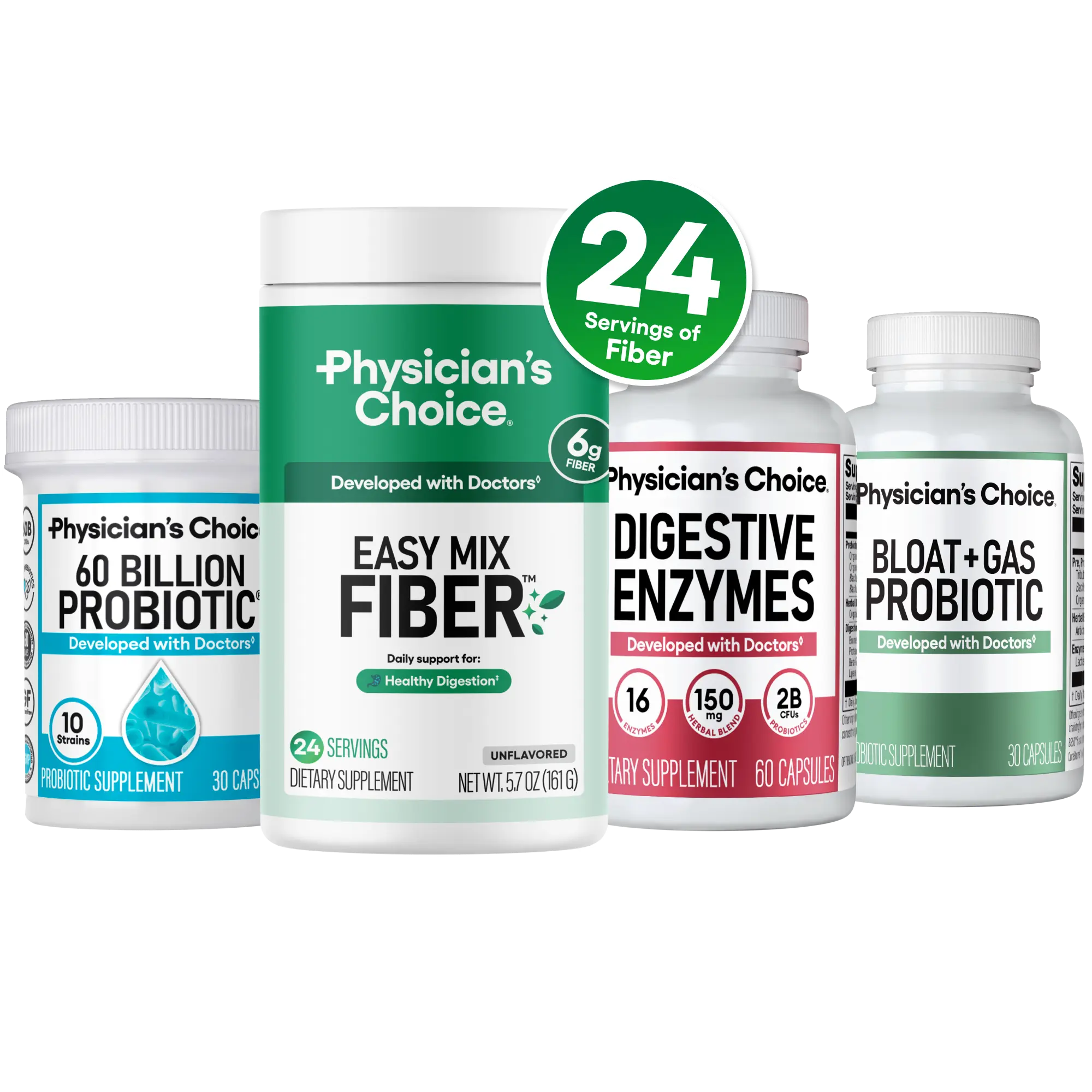 Physician's Choice Complete Gut Support System Bundle combines 60 Billion Probiotic, Bloat & Gas Probiotic, Digestive Enzymes & Easy Mix Fiber for total digestive balance, comfort, and wellness.