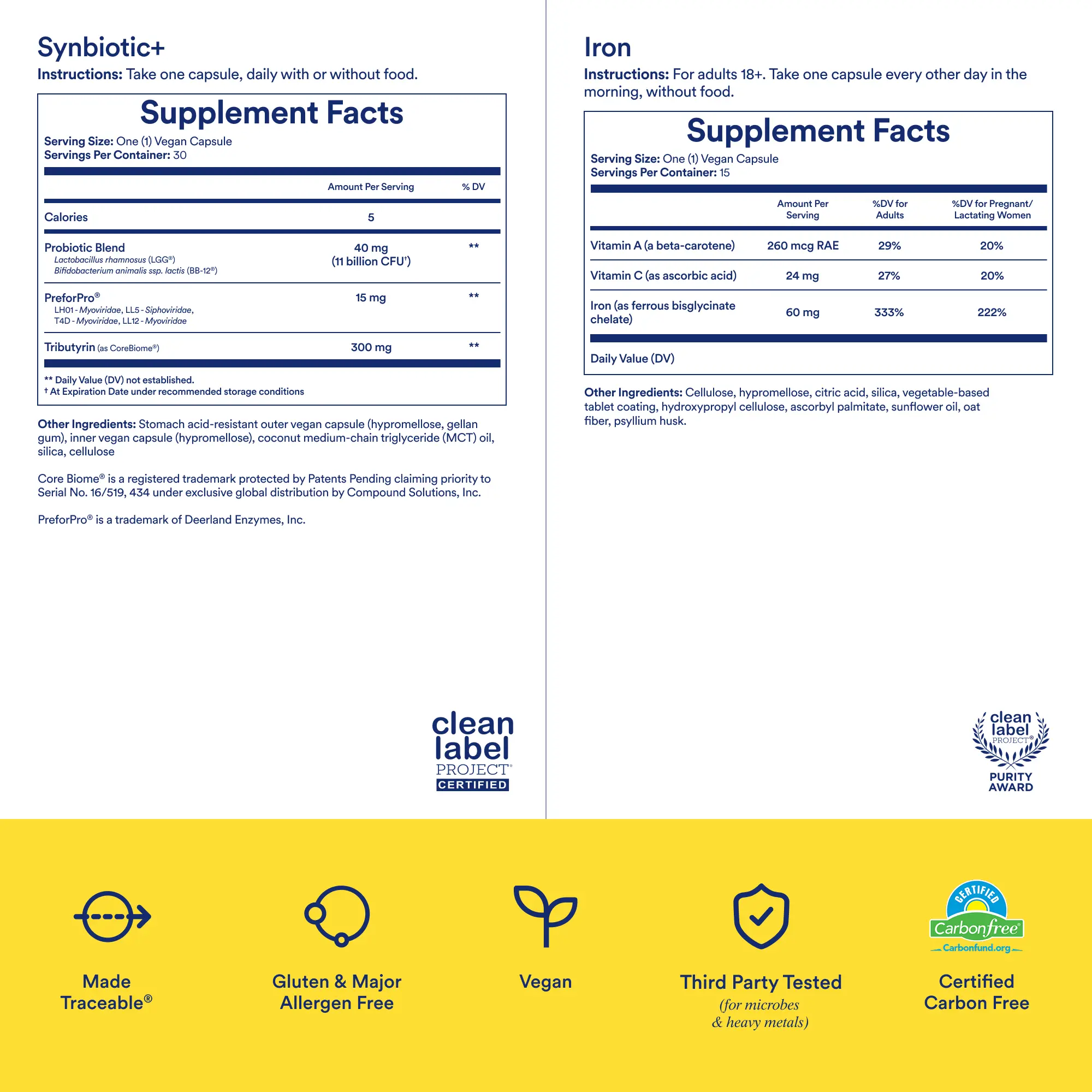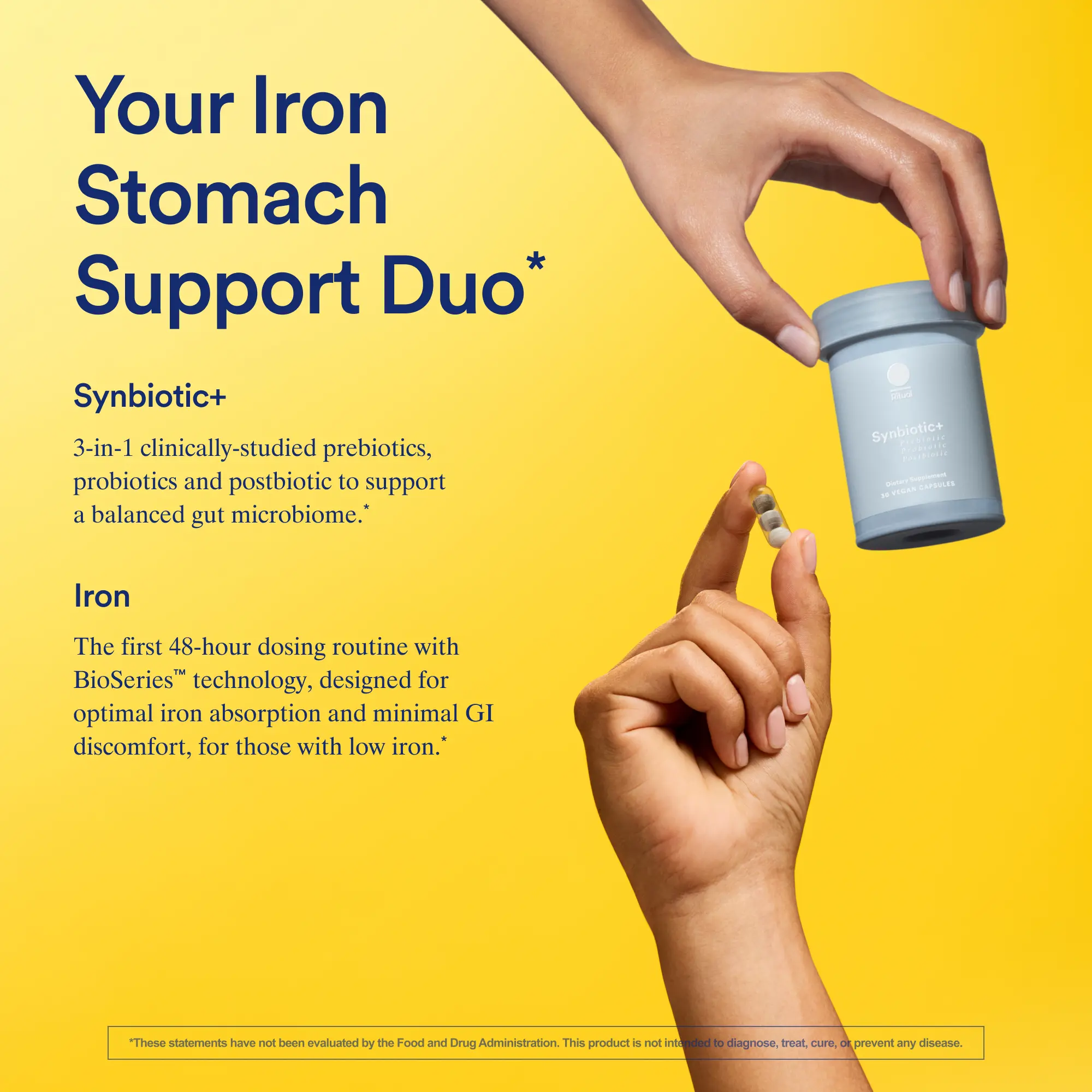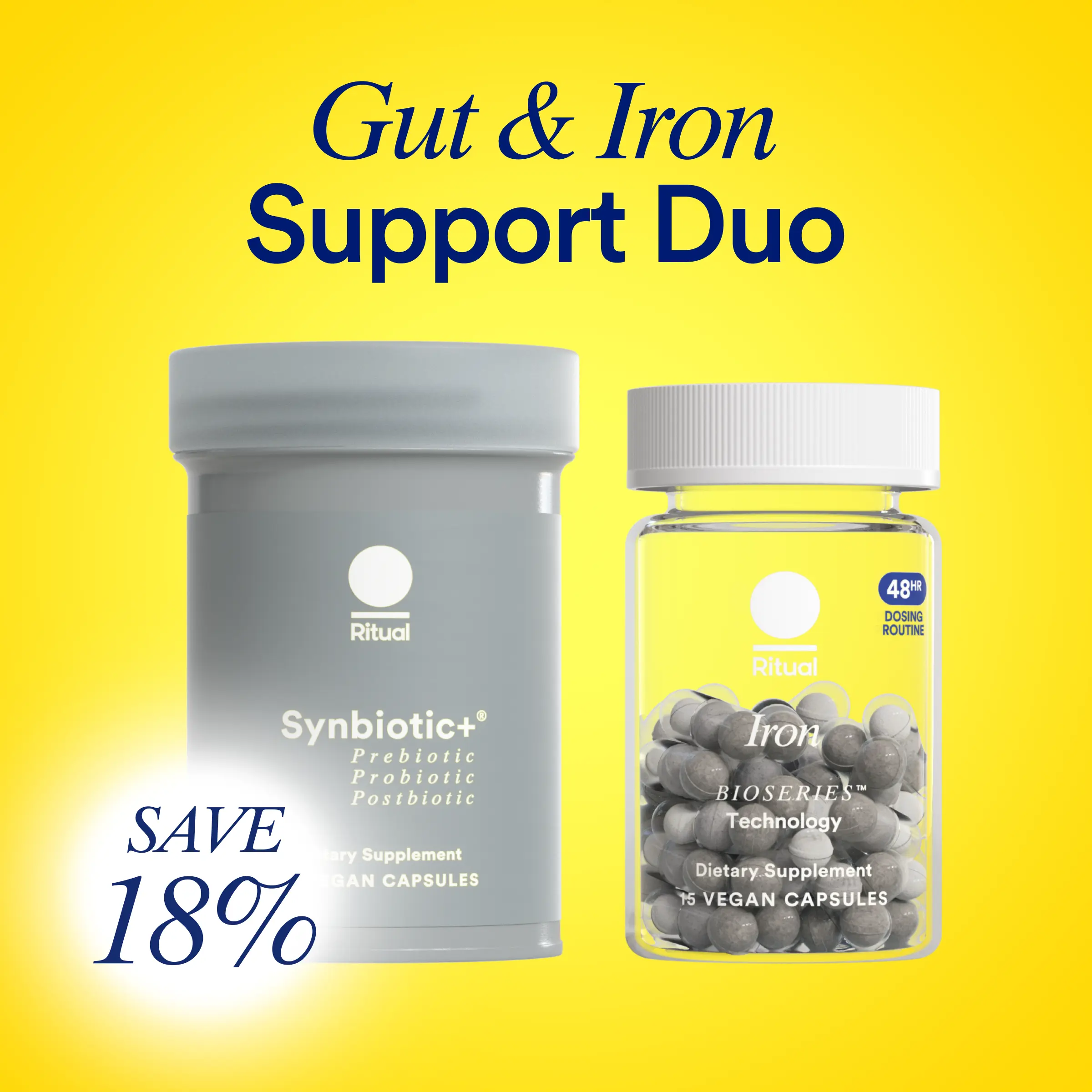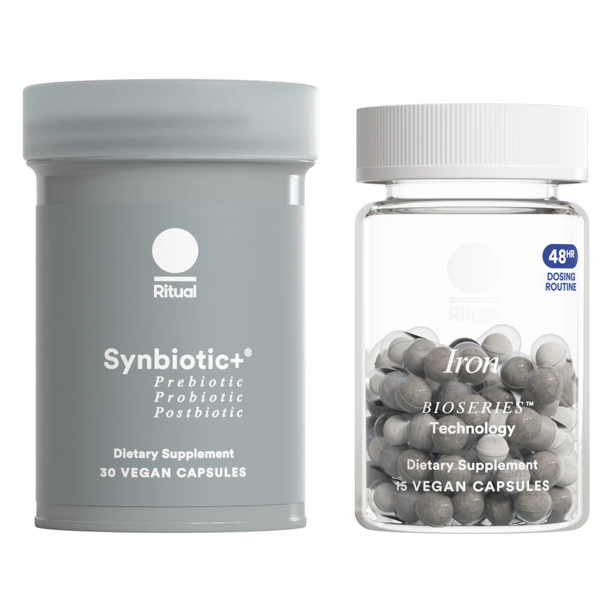 ·The Iron Stomach Support Duo featuring a monthly supply of Ritual’s new Iron BioSeries as well as Synbiotic+, a 3-in-1 formula with prebiotics, probiotics and postbiotics to support a balanced gut microbiome.*