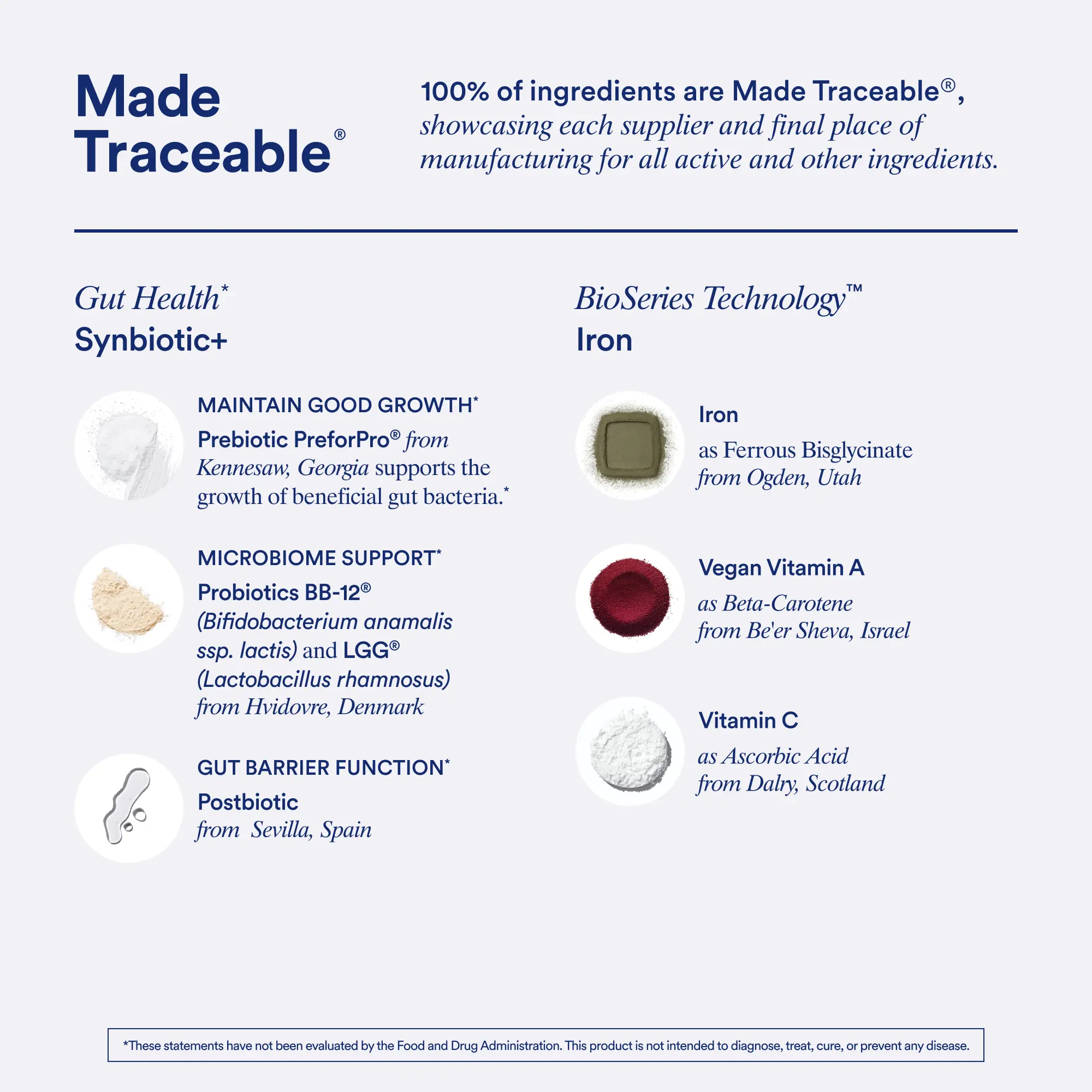 ·INGREDIENTS: Ritual Iron BioSeriesTM is designed with an alternate-day dose of 60 mg bioavailable iron as ferrous bisglycinate, formulated to release gradually over 6 hours, and includes Vitamins A and C to support Iron absorption. Synbiotic+ contains probiotic strains LGG & BB-12 to support healthy regularity as well as relief of occasional discomforts such as mild and occasional bloating, gas, and diarrhea, as well as pre and postbiotic strains.*