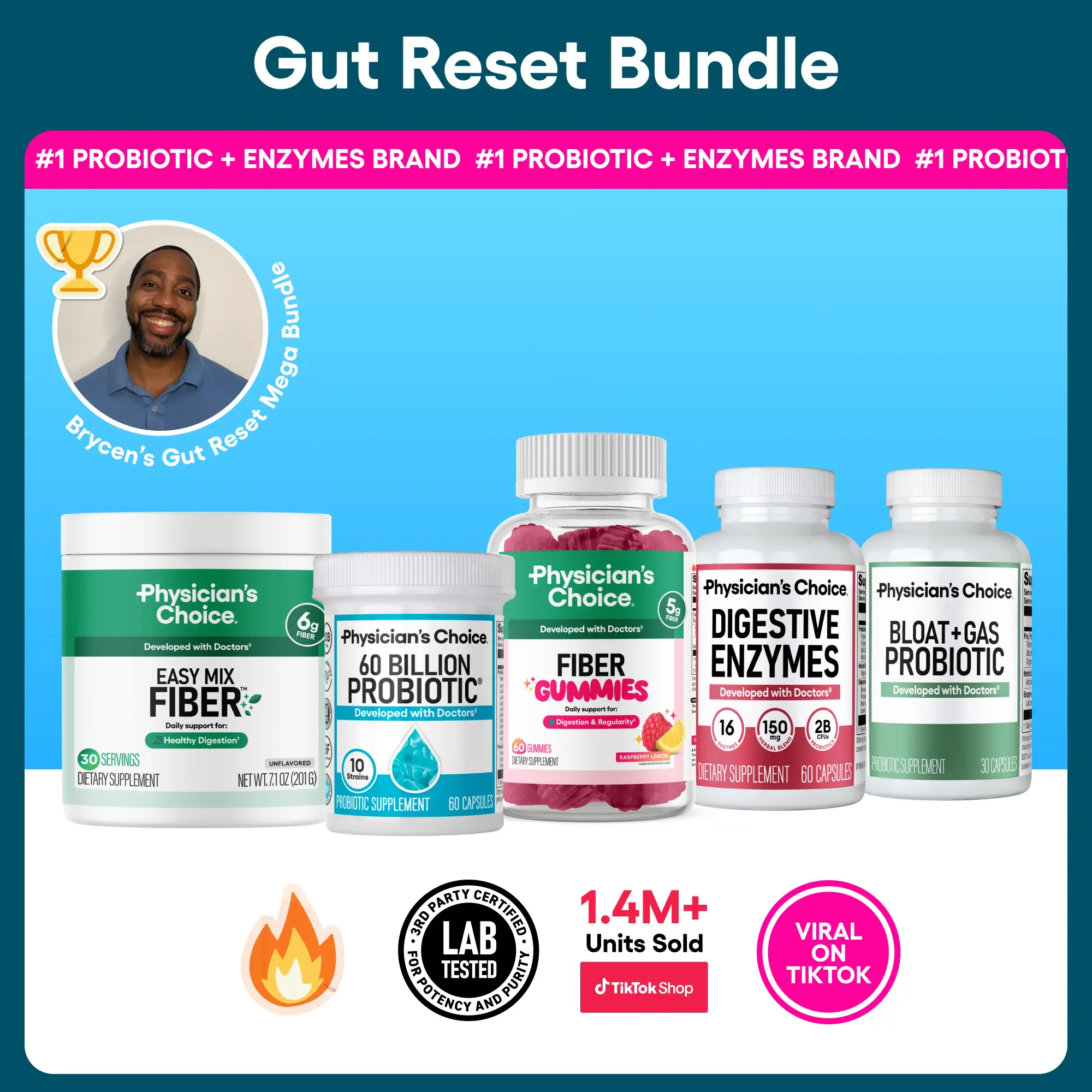 Brycen's Gut Reset Mega Bundle: Featuring 60 Billion Probiotic, Bloat & Gas Probiotic, Digestive Enzymes, Fiber Gummies, and Easy Mix Fiber Powder. Perfect for digestive balance, gut comfort, and daily fiber support.
