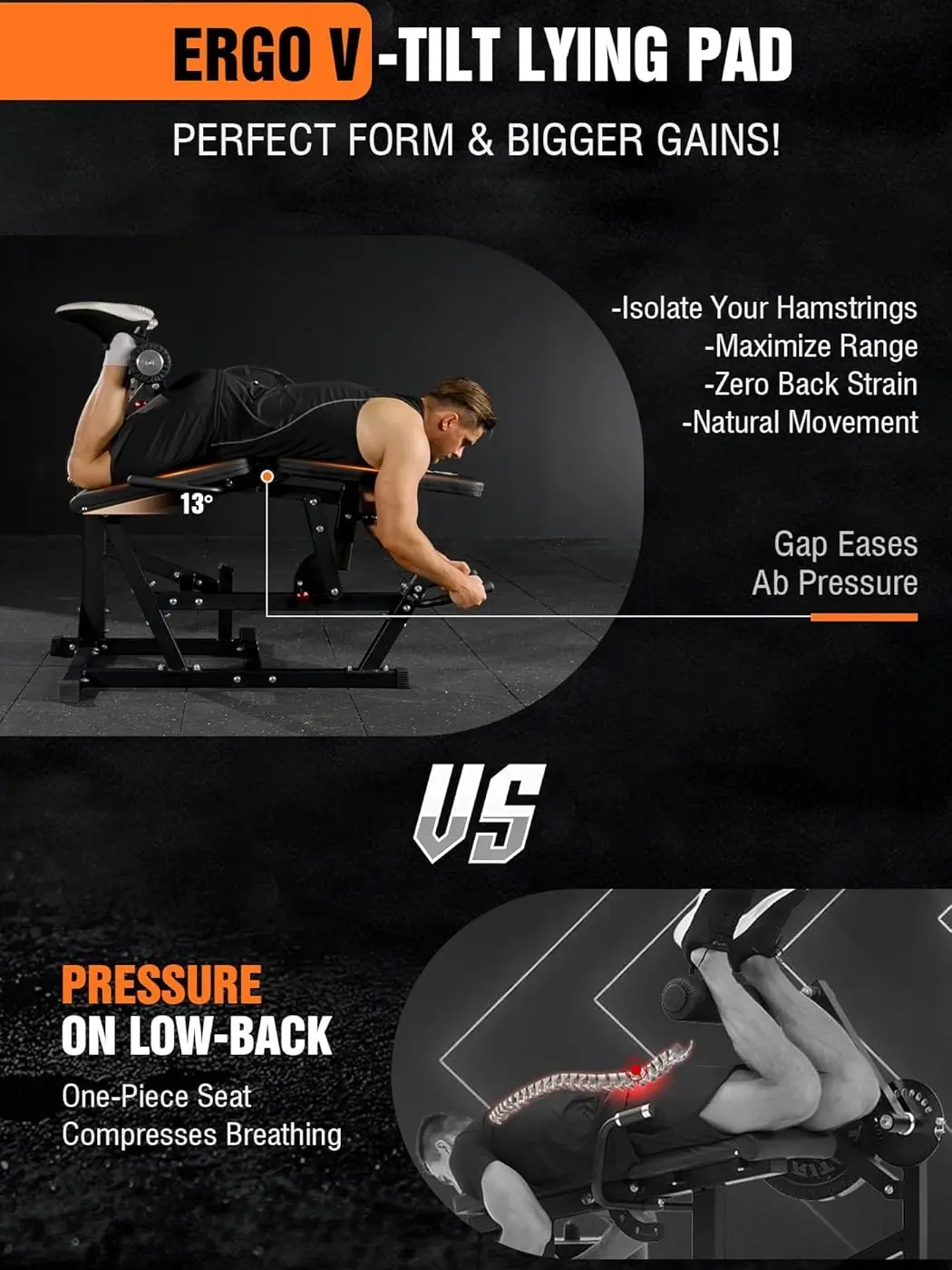 ·Pro Comfort & Performance: Engineered for leg curls, our 13° V-tilt design and ab-gap feature significantly reduce lumbar pressure, isolate hamstrings, and eliminate ab compression—unlike one-piece flat benches that cause back strain and restrict breathing. The extra-wide seat offers unmatched freedom of movement and comfort, supporting massive growth. Professional anti-sag ankle rollers ensure smooth, pain-free training.