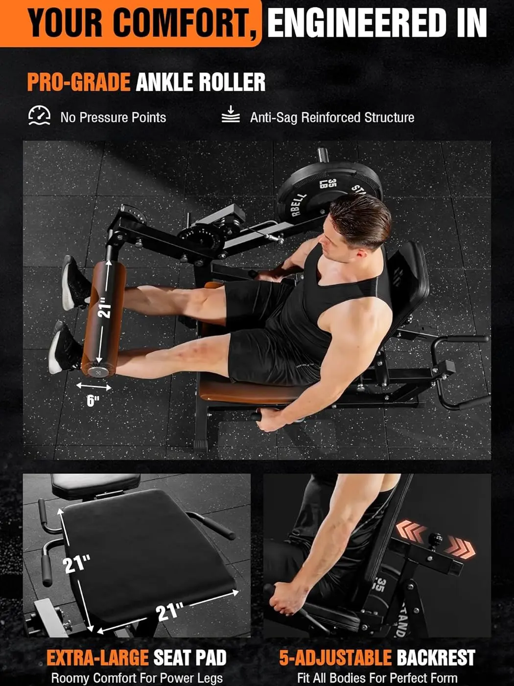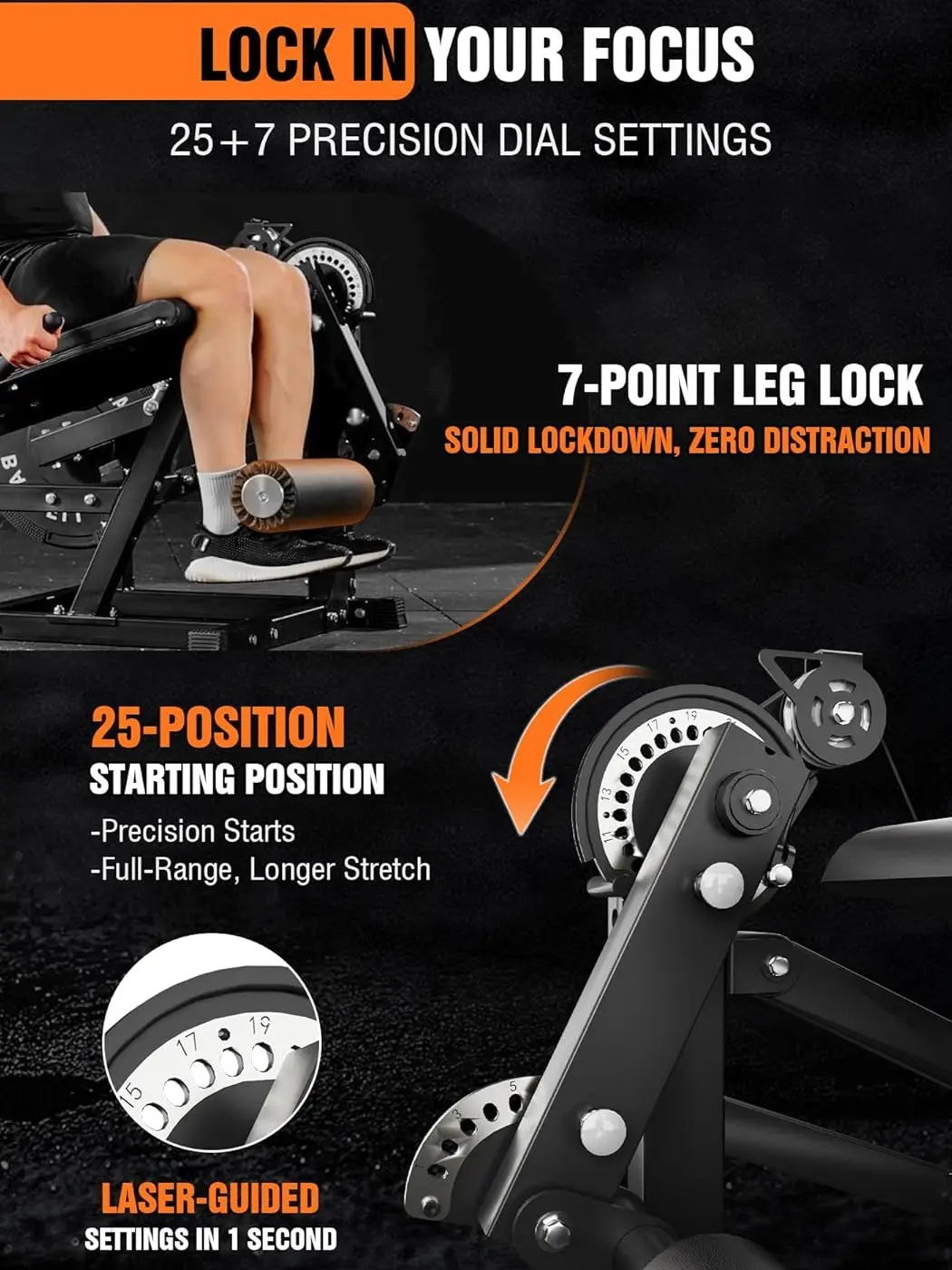 ·Precision Fit & Rapid Setup: Customize your leg workout machine in seconds with 25 starting positions and laser-etched dials for precision stretching and full-range motion. The 7-point leg lock ensures rock-solid stability and zero distractions, while the 5-adjustment backrest supports perfect knee alignment and form for every body. Lock in your gains—train smarter, lift stronger!