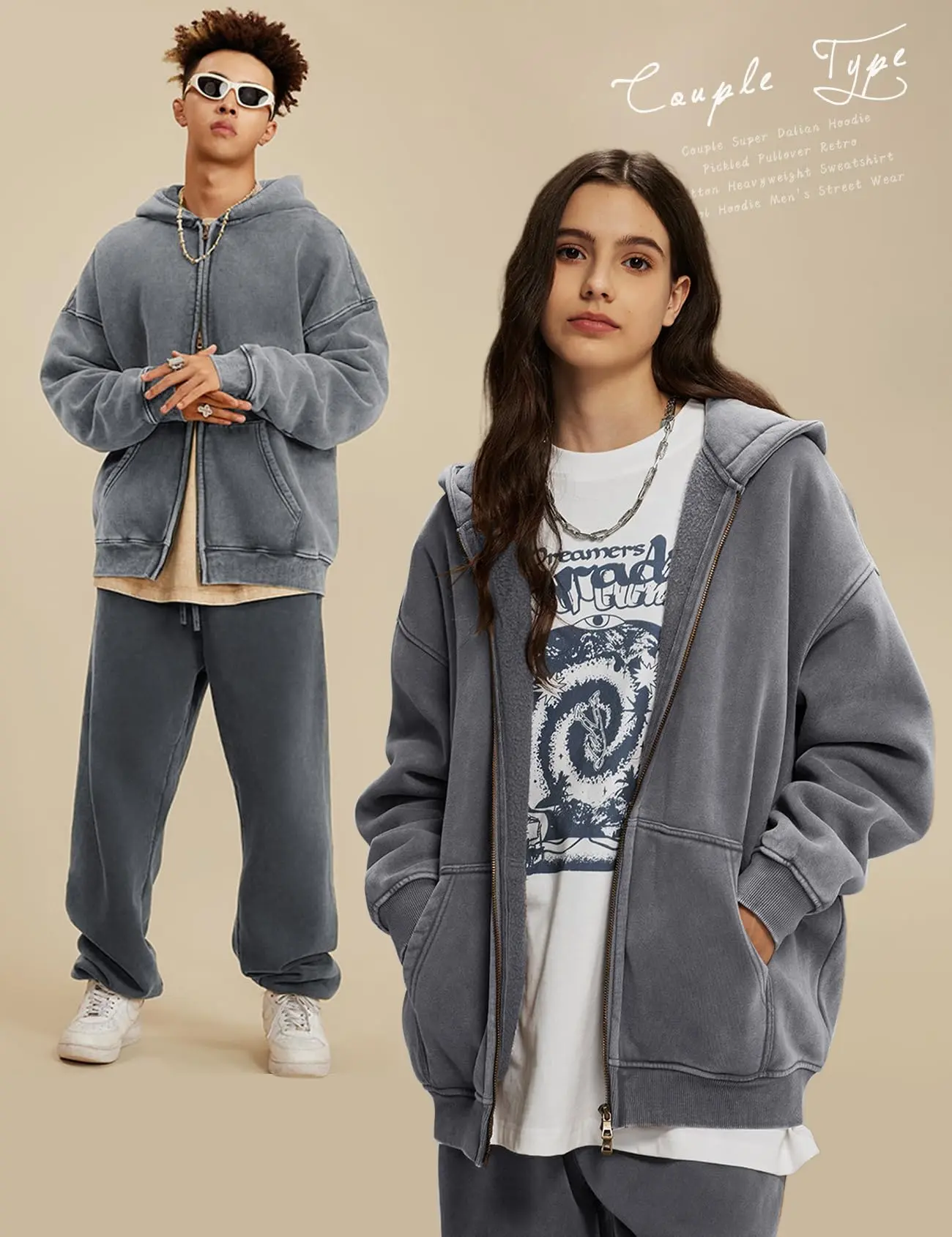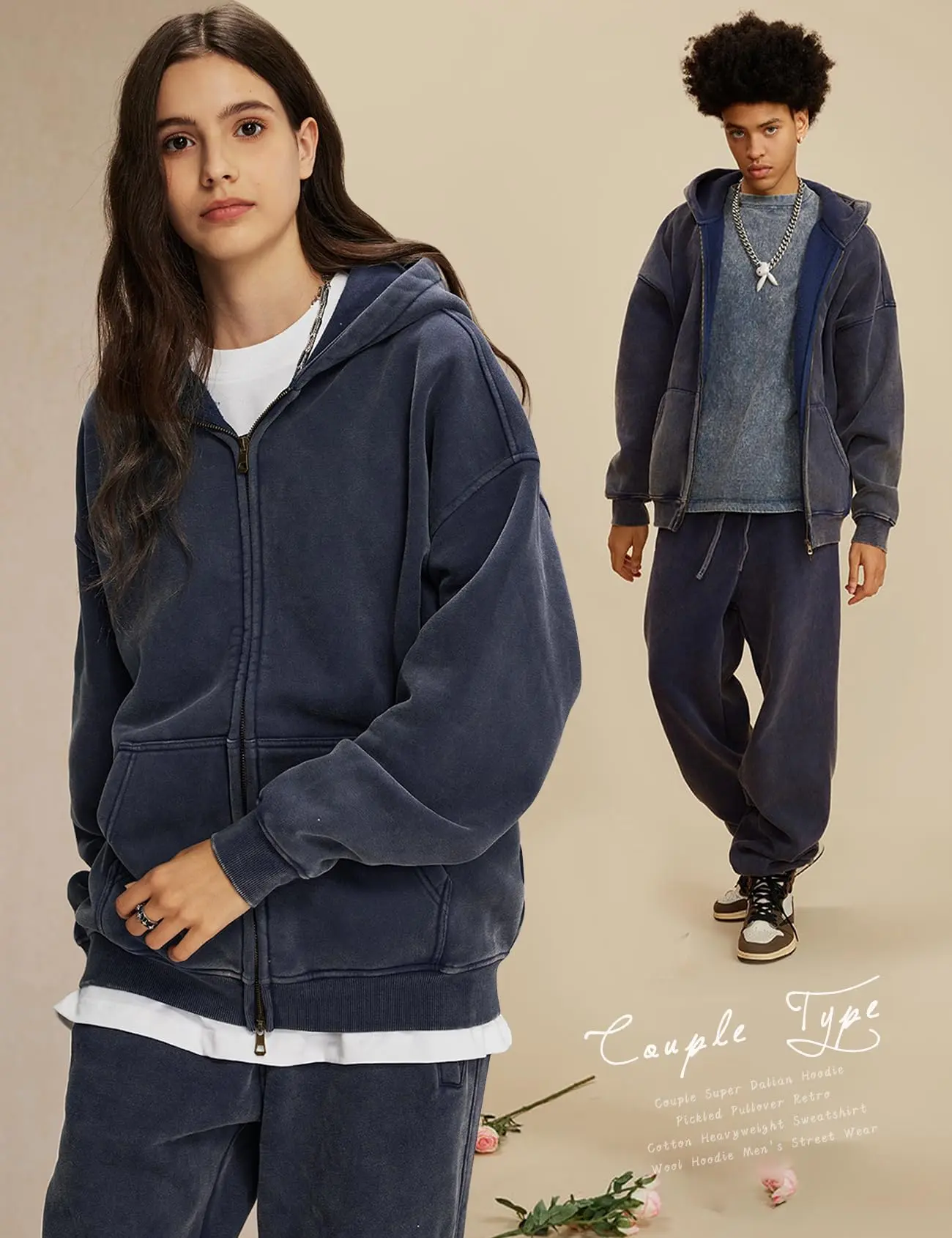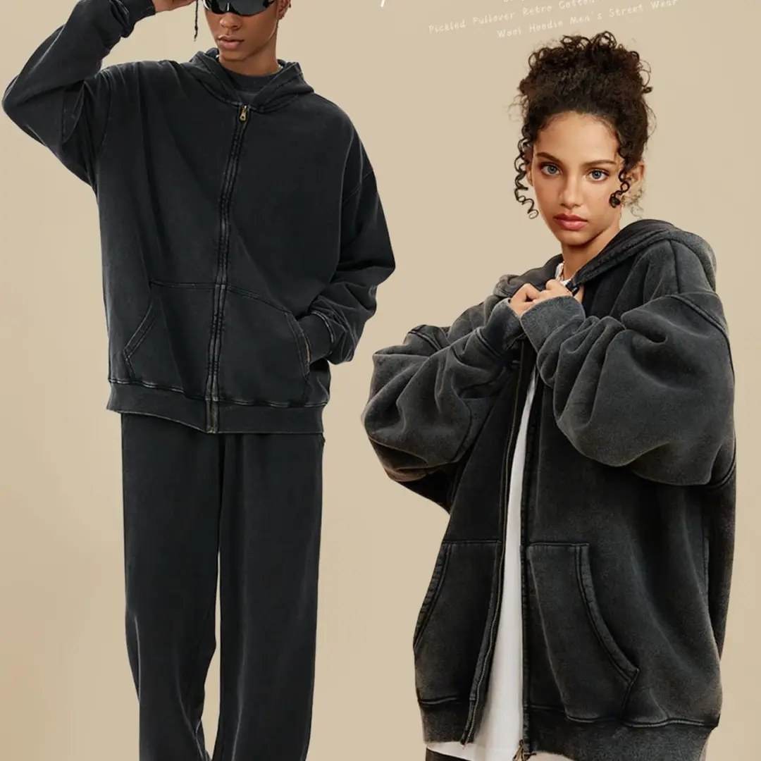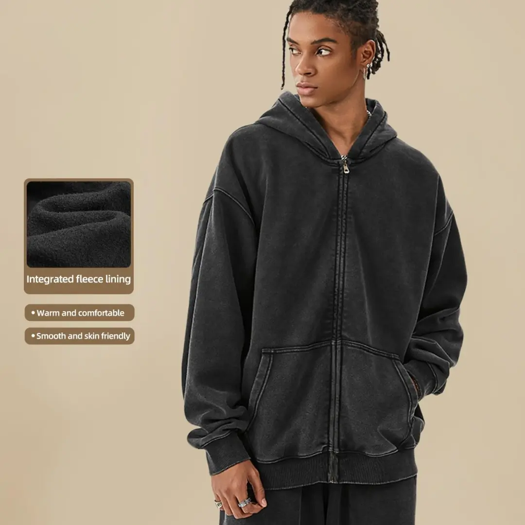·Features: Oversized zip up hoodie for men design with double zipper, ribbed cuffs, long sleeve, kangaroo pocket, drop shoulder, unisex acid washed hoodie vintage style