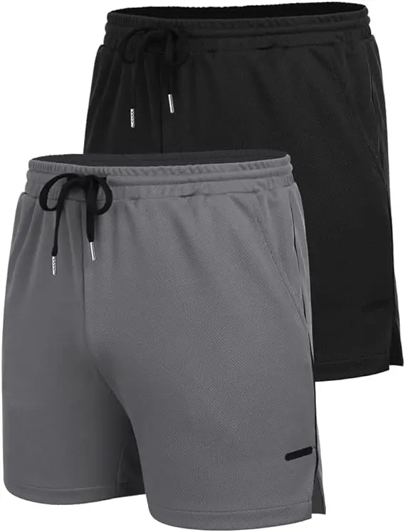 ·Men's workout shorts feature with elasticized waist with adjustable drawstring, 2 pockets on side seam to store all of your small essentials, solid color, 2 pack in different colors, open flap design allows more movement for weight training.