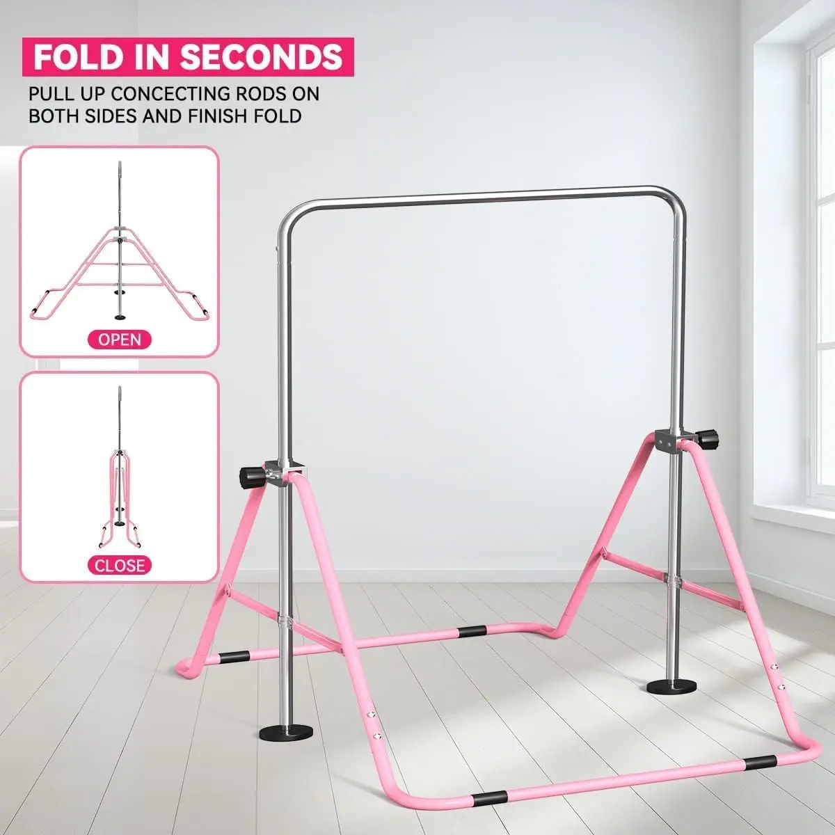 · Foldable & Easy to AssembleDesigned for quick setup, this kip bar can be assembled in minutes and folded for convenient storage. Ideal for home practice spaces, apartments, playrooms, or gymnastics training areas.