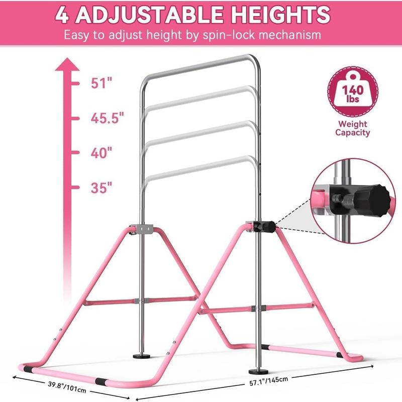 · Adjustable Height with Dual Lock SystemFeatures four height settings from 35" to 51", allowing the bar to grow with your child. The secure dual-lock mechanism ensures stability and safety during training, making it suitable for kids of various ages and skill levels.
