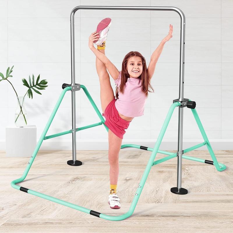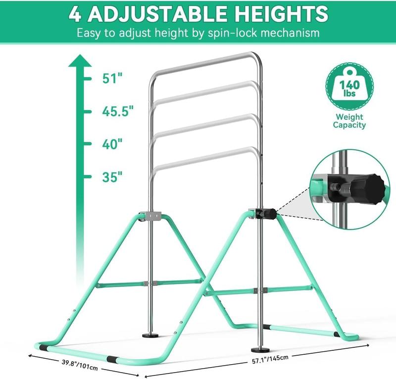 This adjustable gymnastics bar offers four height settings (35", 40", 45.5", 51"), making it suitable for kids aged 3–8 years. It supports up to 140 lbs, ensuring long-term use as your child grows and improves their skills.