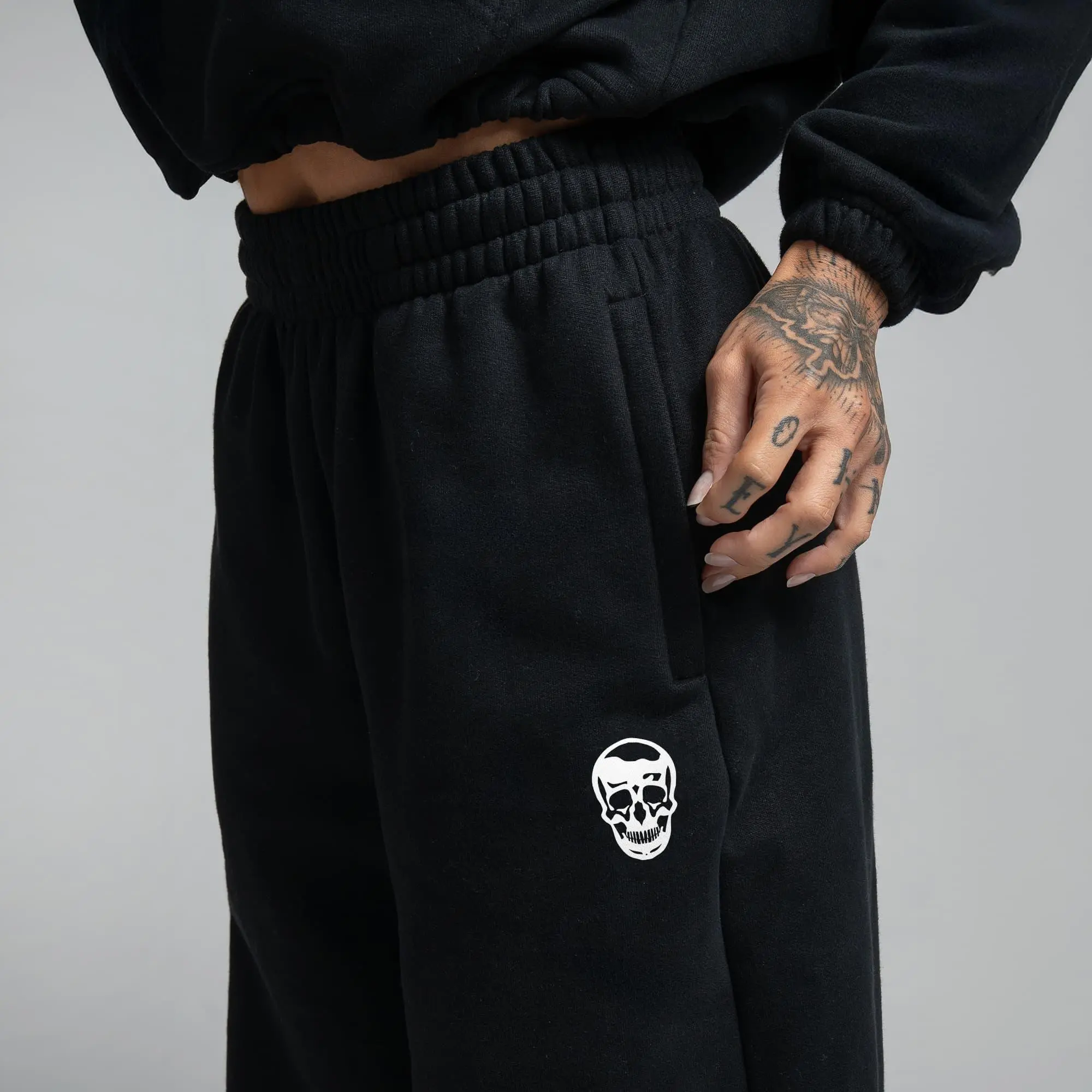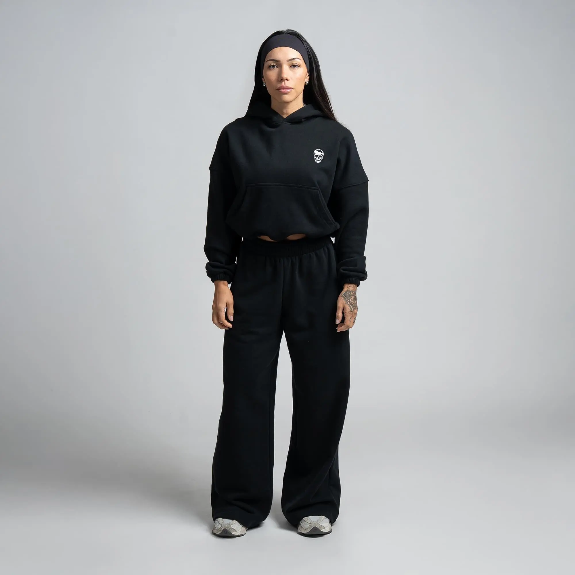 The model is 5'4", 140 lbs, and is wearing size Small in both pieces. The set includes a flattering wide-leg jogger silhouette and an adjustable cropped hoodie with zippered storage and adjustable drawcords.