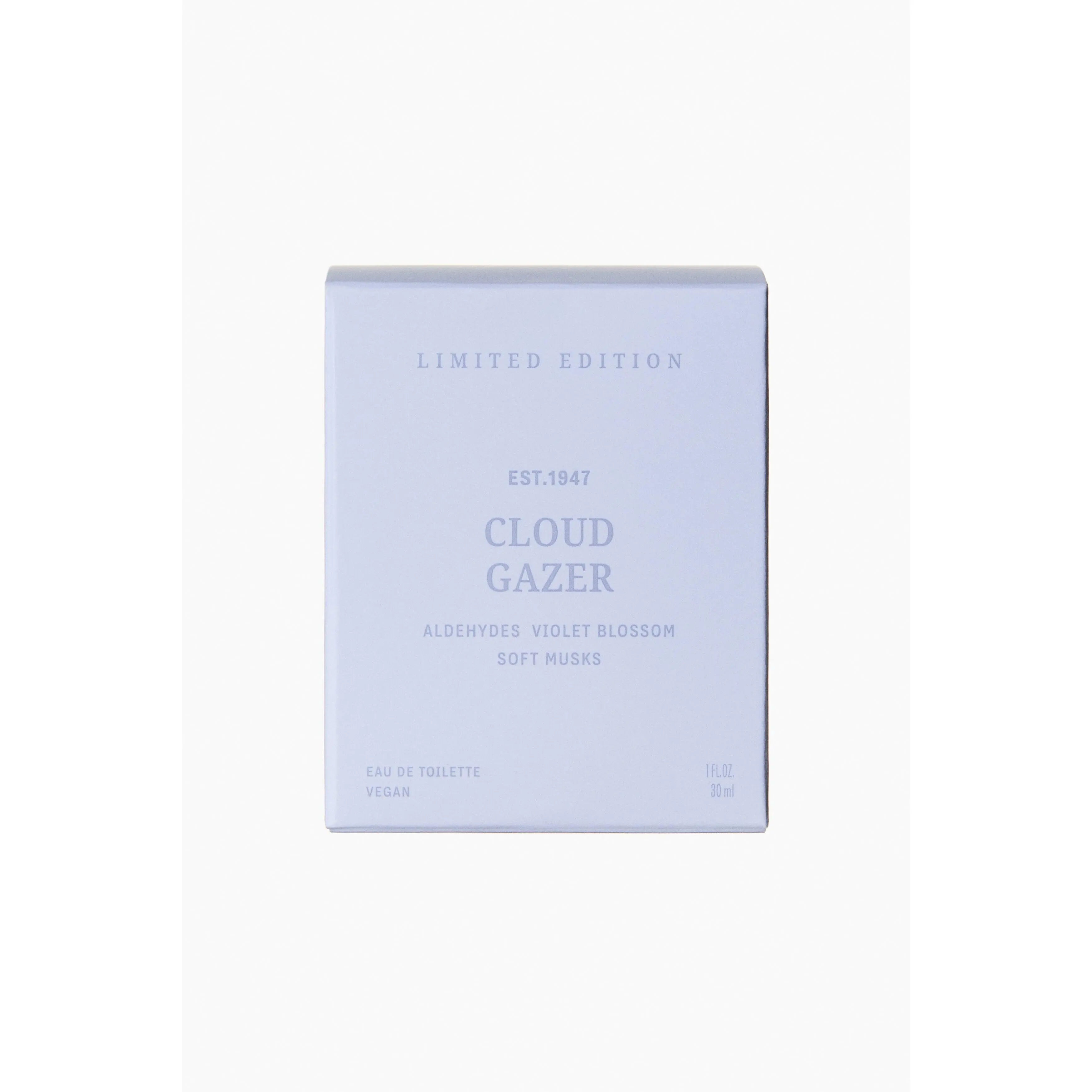 Limited Edition. Aldehydes, Violet Blossom, Soft Musk. Thoughts drift across a pale sky. Violet musk and a whisper of calm. You're somewhere else โ yet fully here. Top Notes: Aldehydes, Mandarin. Mid Notes: Muguet, Violet Blossom, Rose, Cedarwood. Base Notes: Heliotrope, Sandalwood, Soft Musk. Vegan. 30ml.