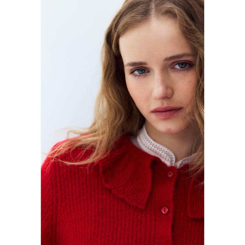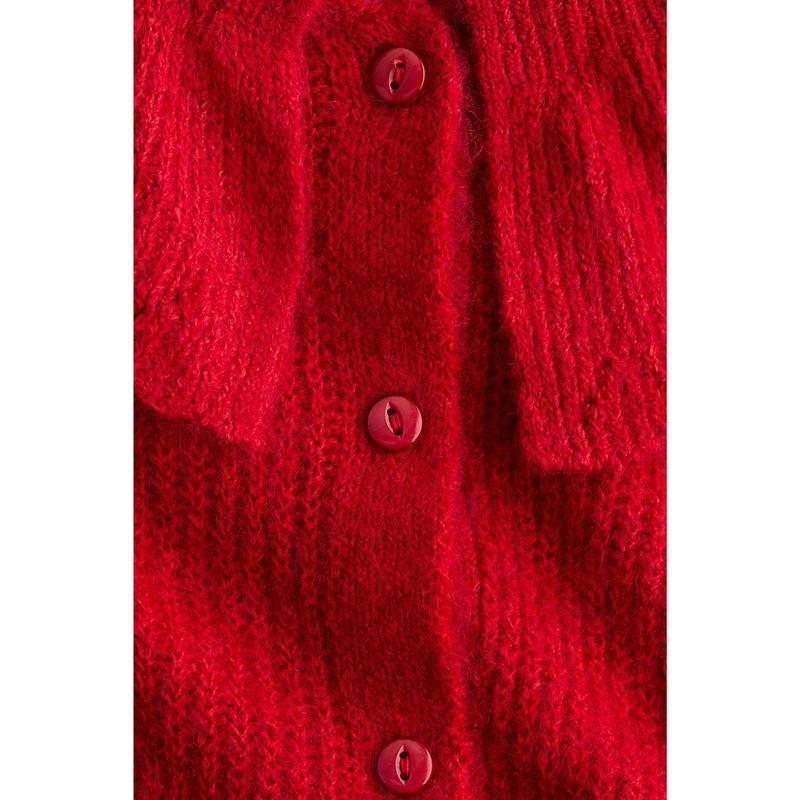 Cardigan in a lofty rib knit containing some wool. Features a Peter Pan collar with a scalloped edge, buttons down the front and long sleeves with scalloped cuffs.
