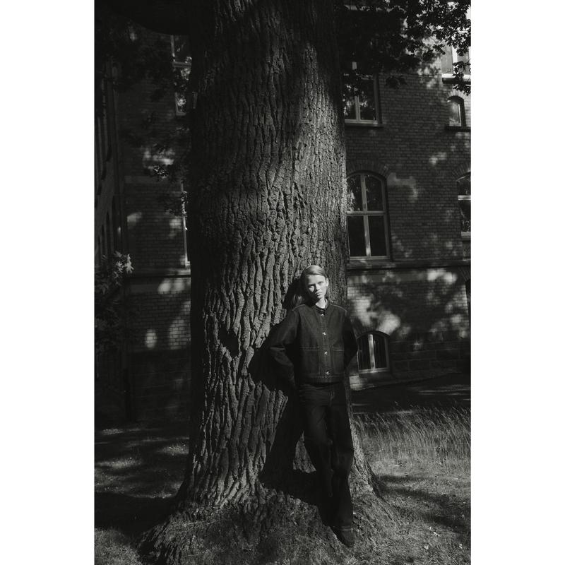 Jacket in cotton twill with a band collar, buttons down the front and patch front pockets. Yoke with an inverted box pleat at the back for a slightly A-line silhouette and long sleeves with buttoned cuffs. Unlined.