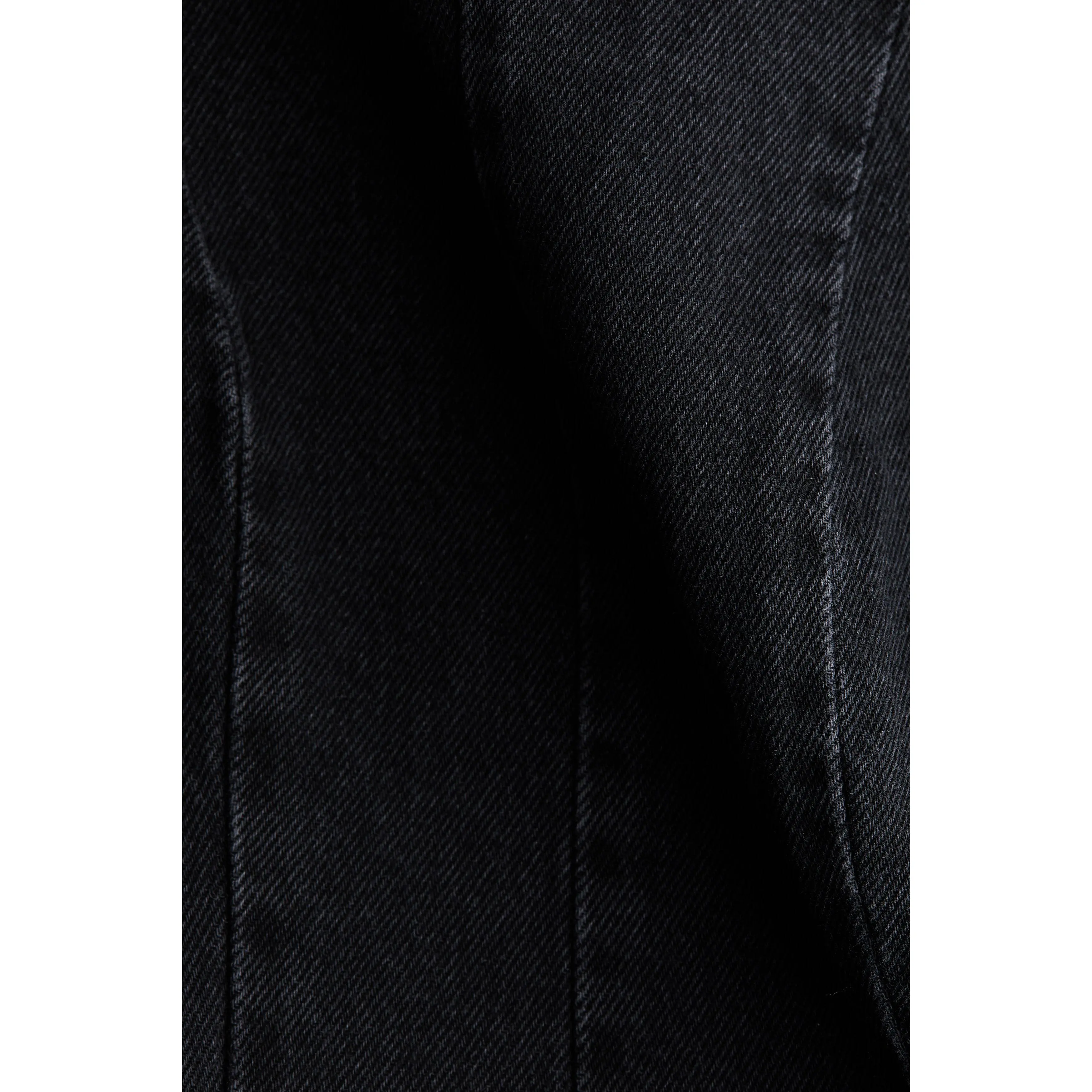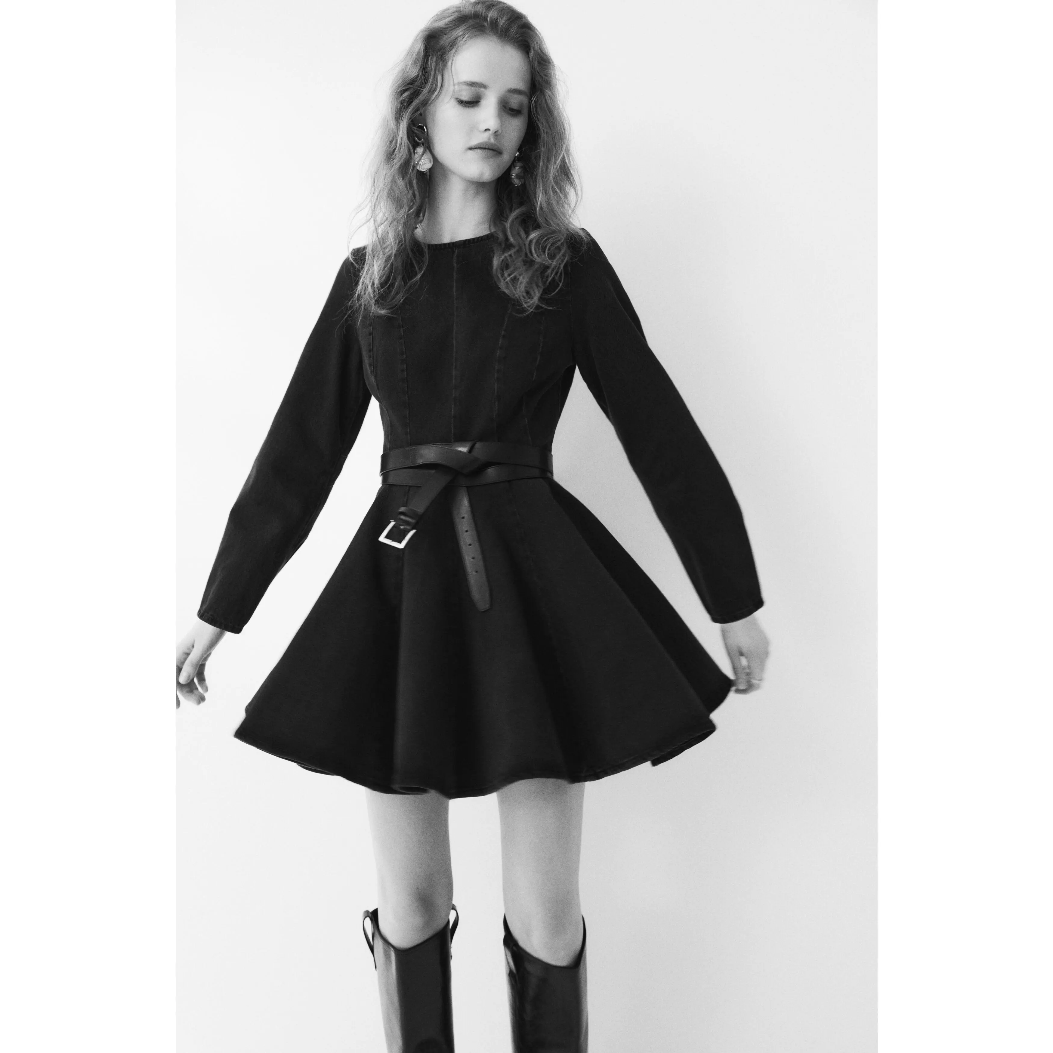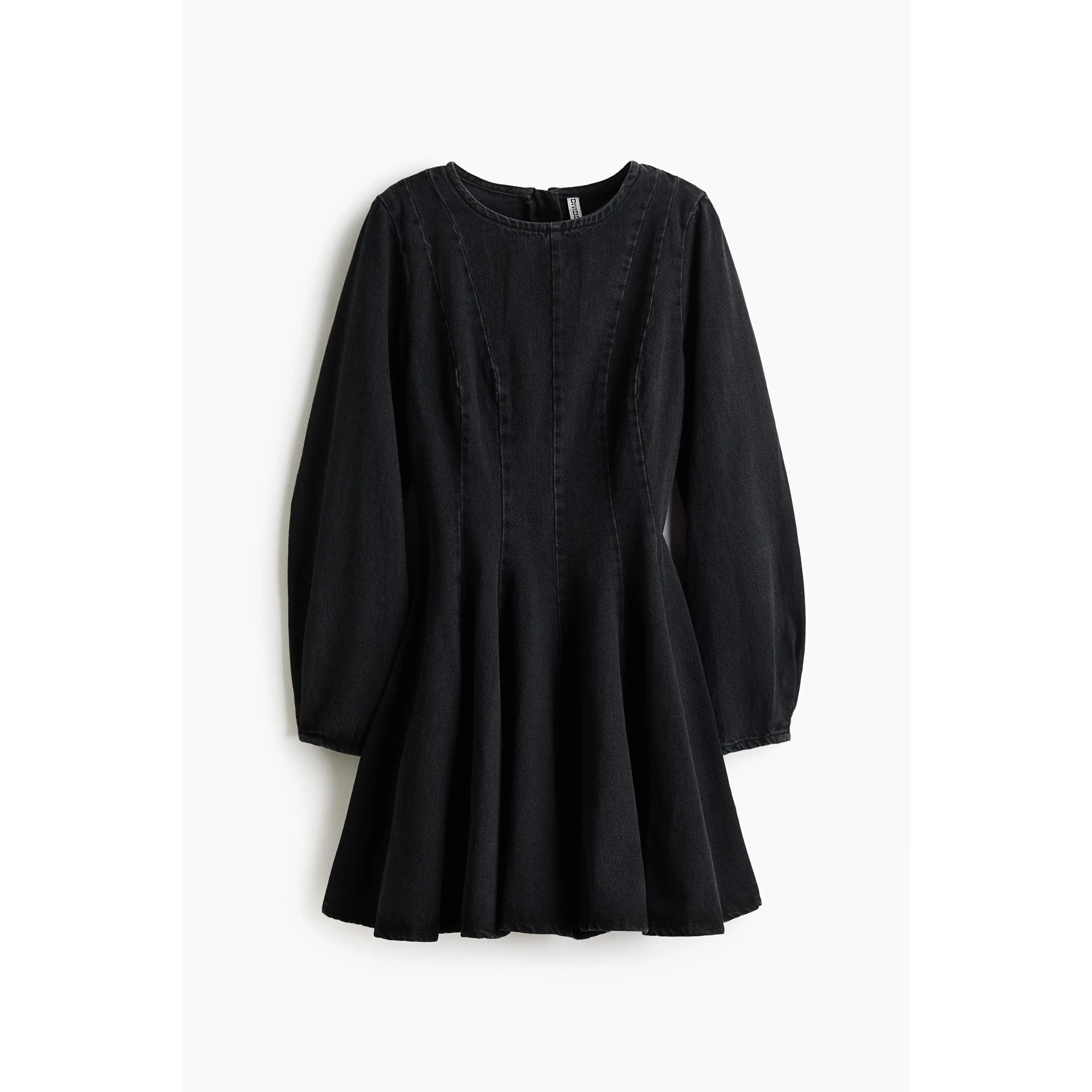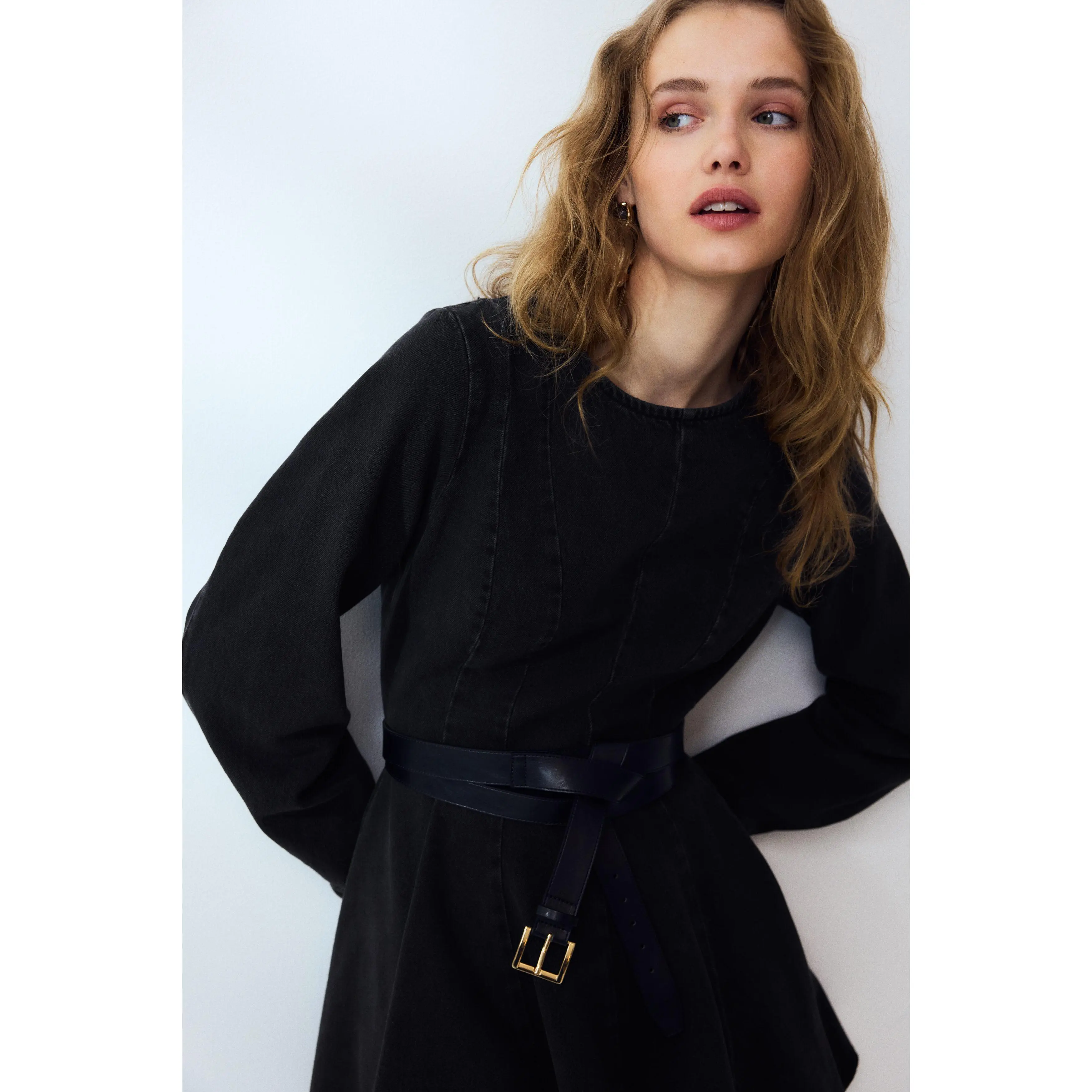 Mini dress in rigid cotton denim featuring a fitted bodice with a round neckline and a concealed zip at the back with a denim zip pull. Long sleeves that taper to the cuffs, shaping seams down the front and back, and a flared skirt.