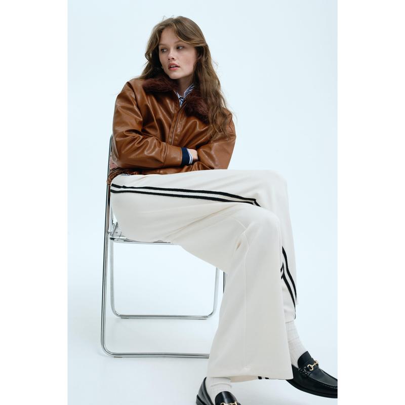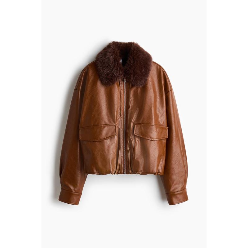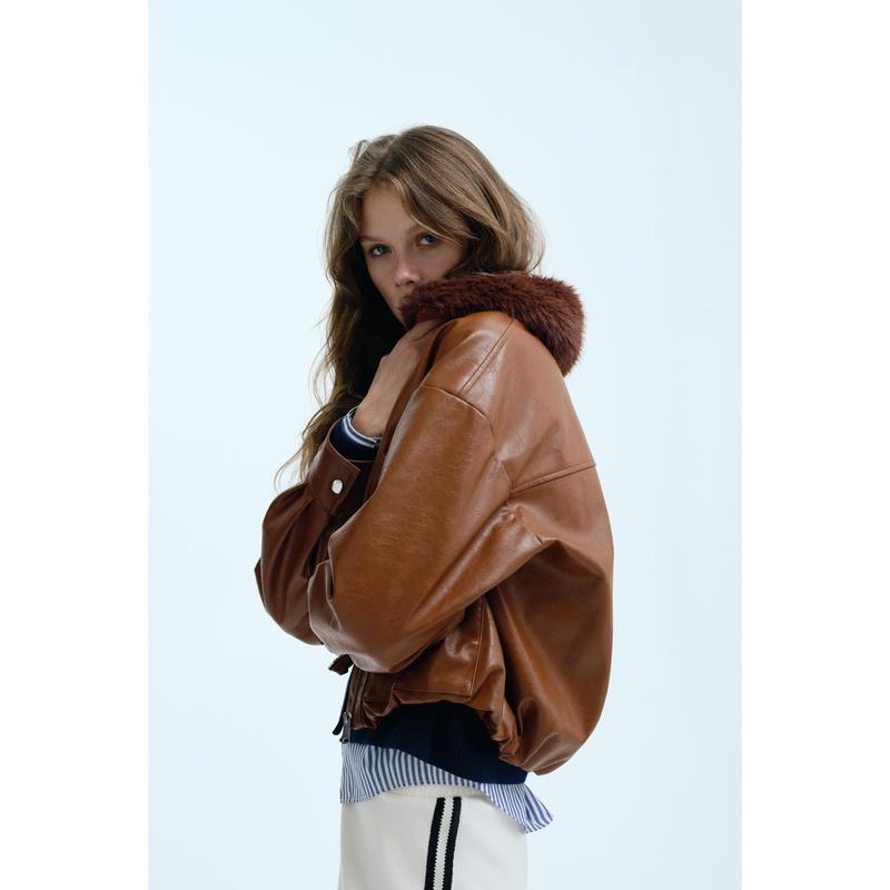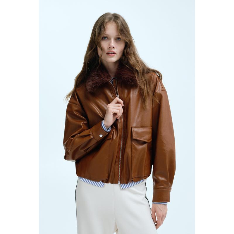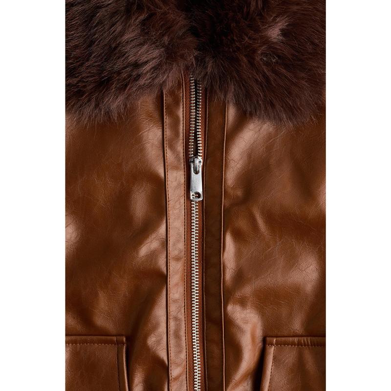 Oversized jacket in coated fabric with a fluffy collar, zip down the front and flap front pockets. Yoke at the back, dropped shoulders, long sleeves with buttoned cuffs and covered elastication at the hem. Lined.