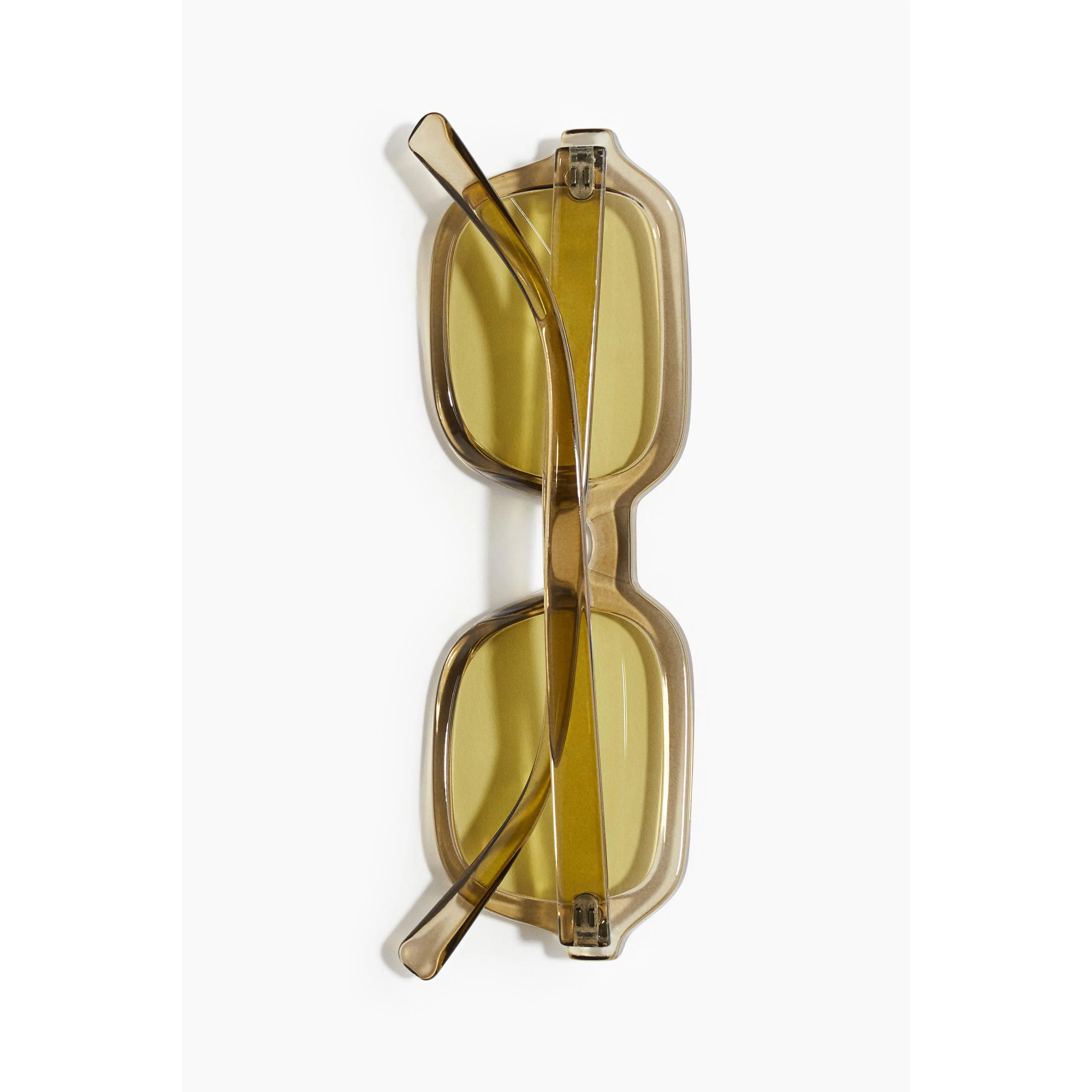 Rectangular sunglasses with plastic frames and sidepieces. Tinted, UV-protective plastic lenses.