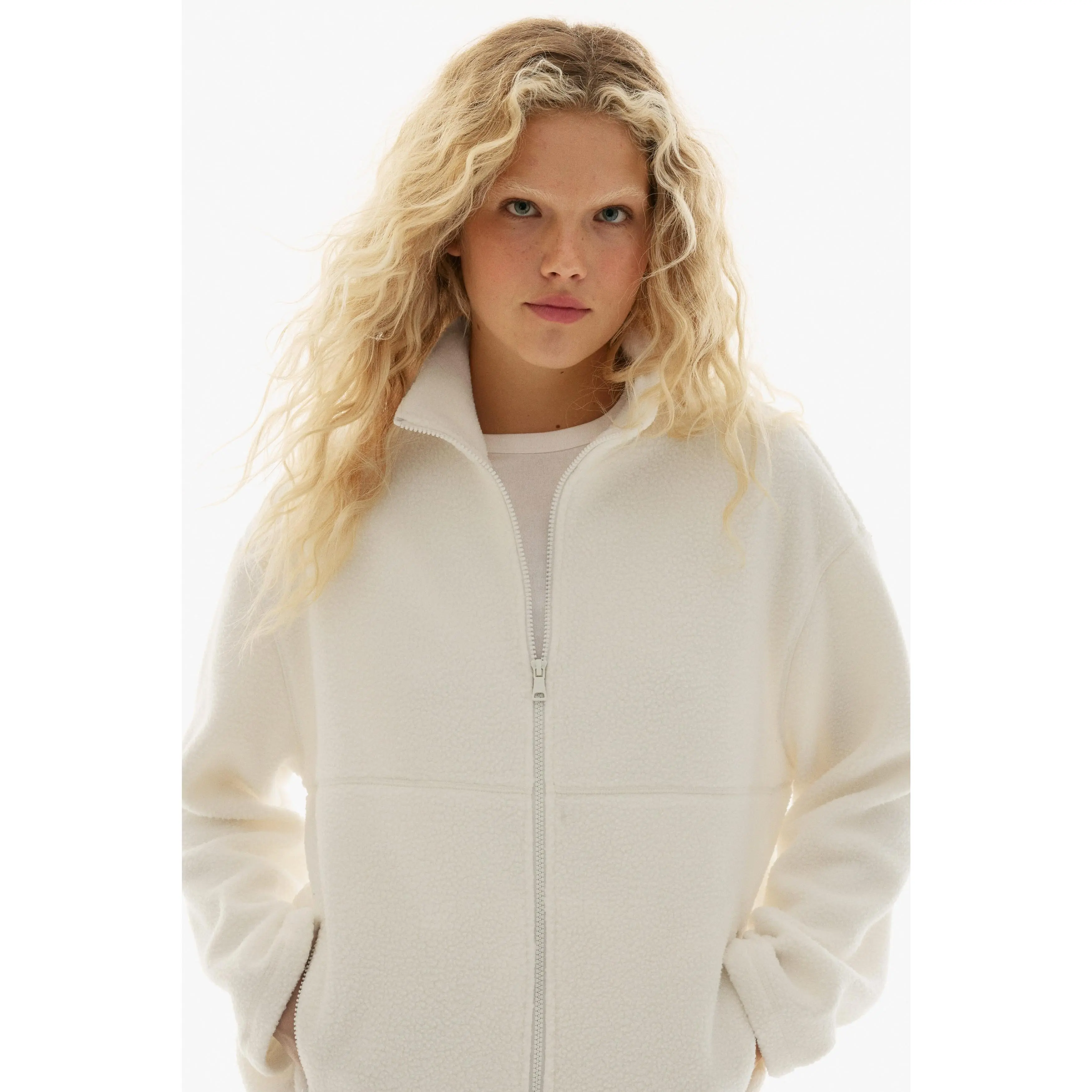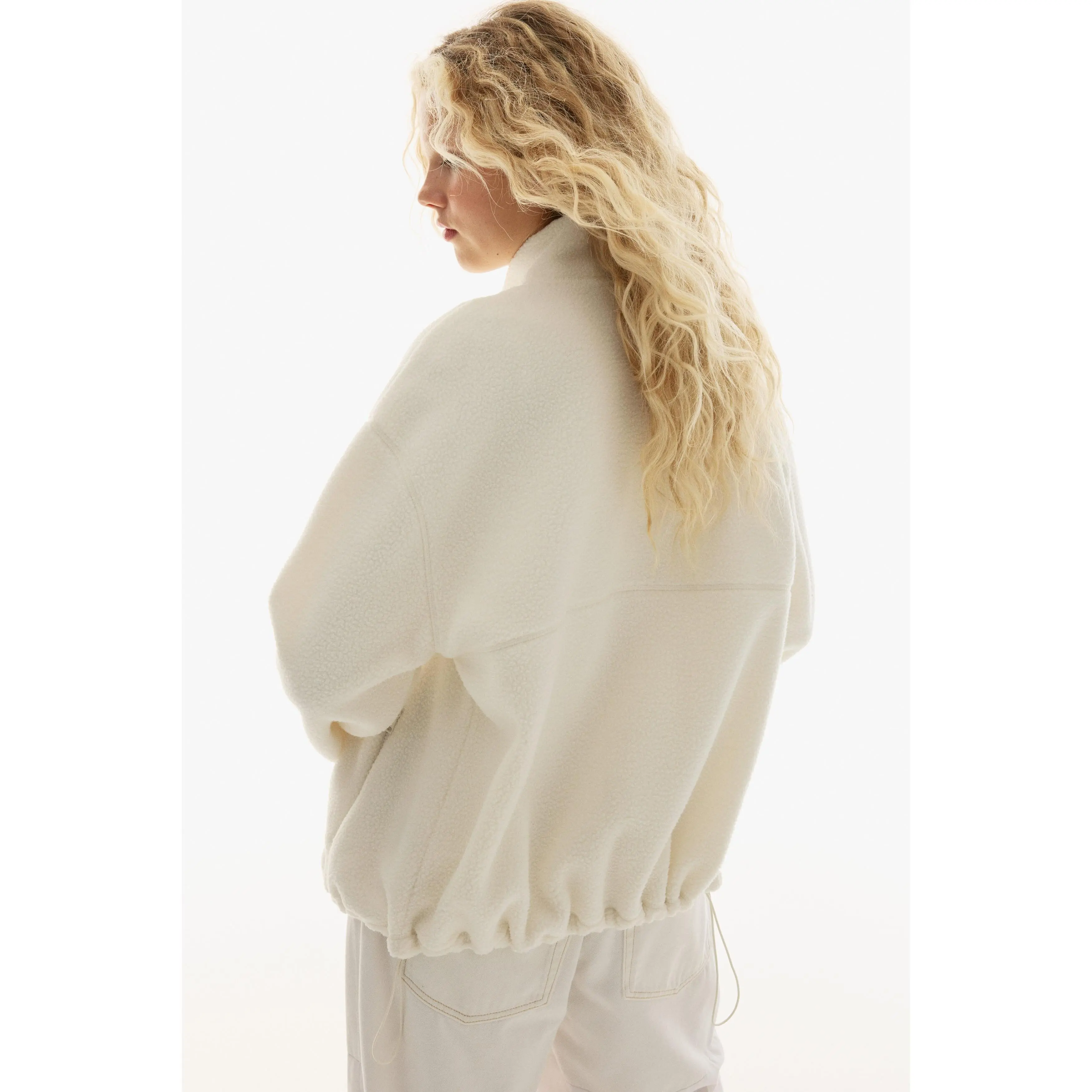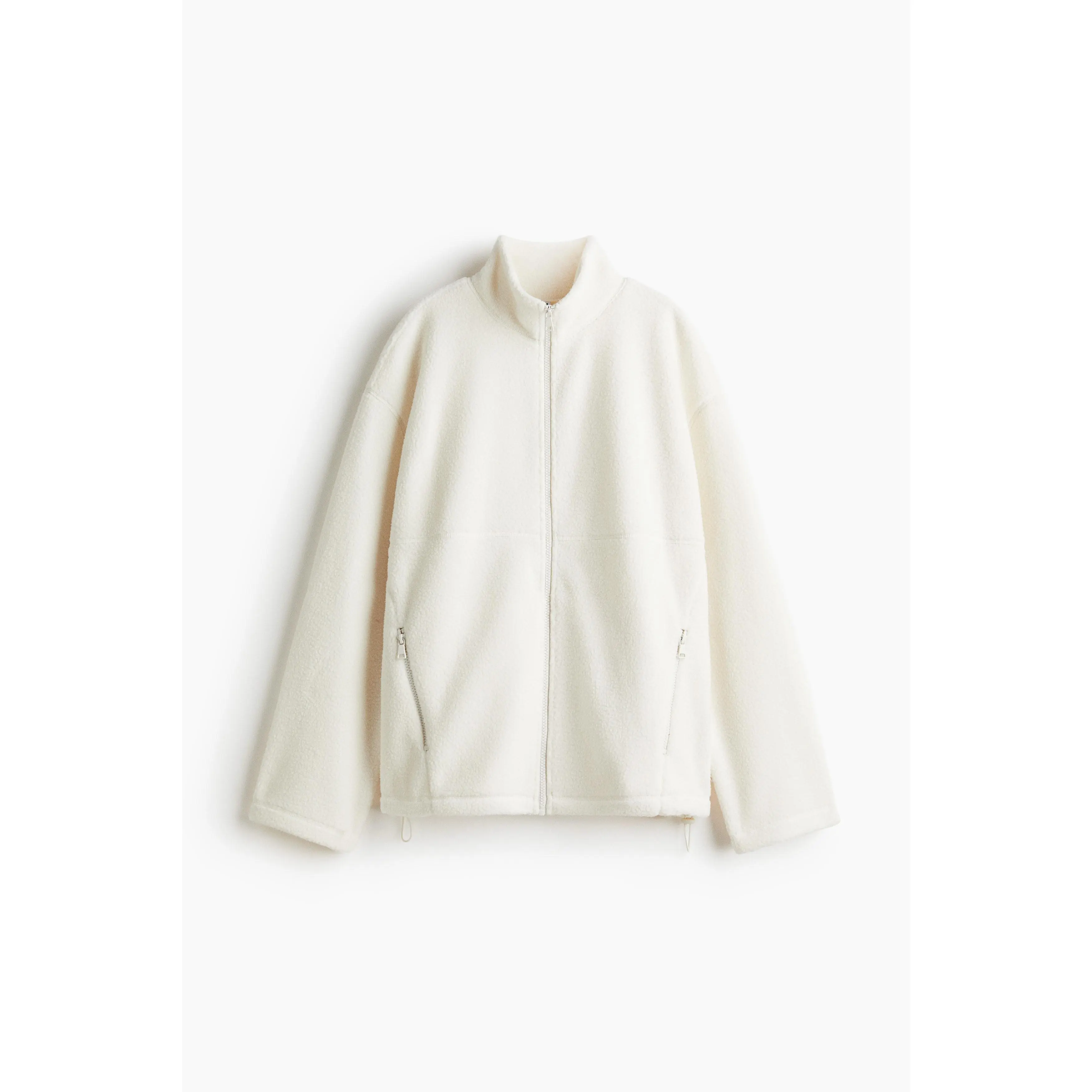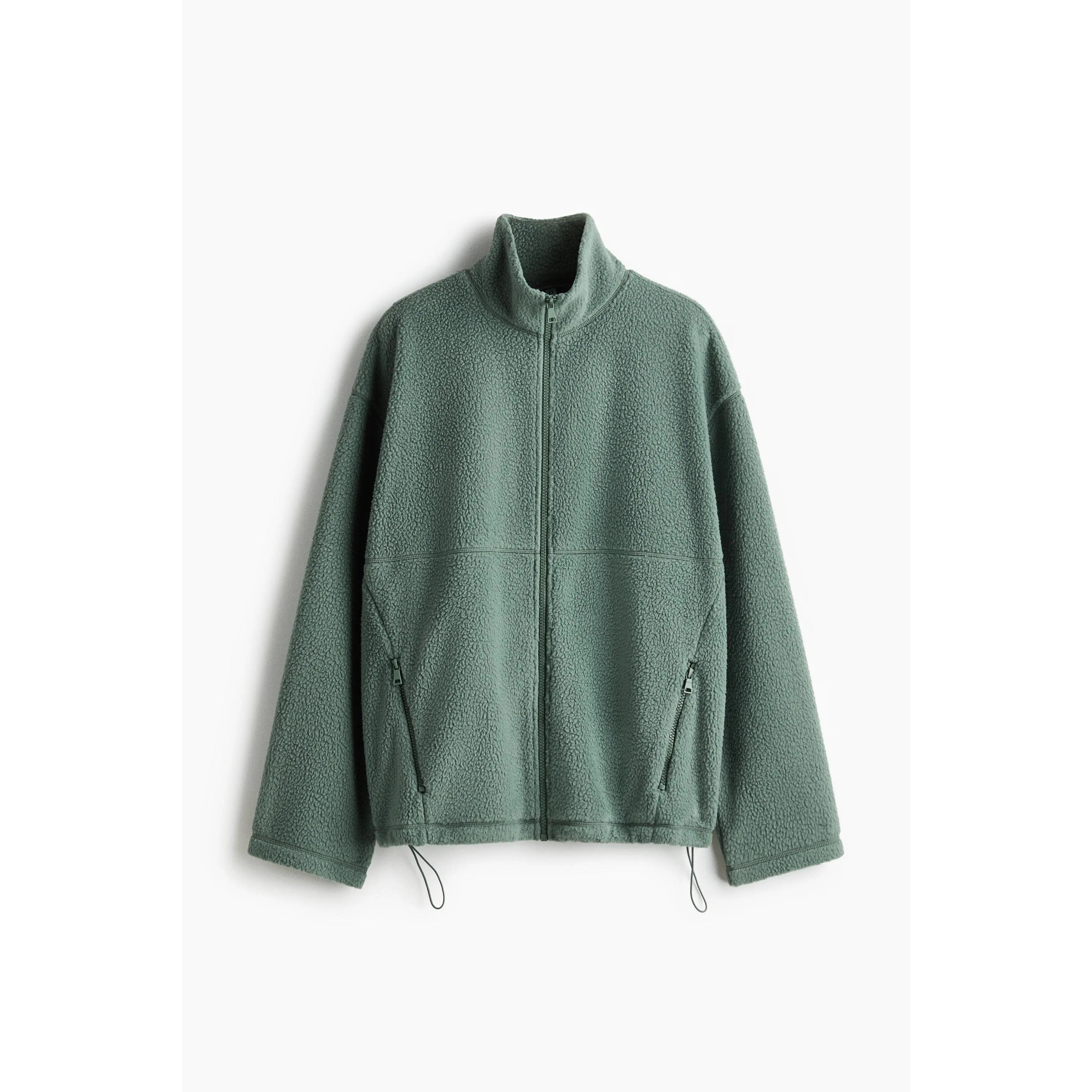 Oversized jacket in soft teddy with a stand collar, zip down the front and zipped side pockets. Dropped shoulders, long sleeves and a drawstring at the hem for an adjustable fit. Unlined.