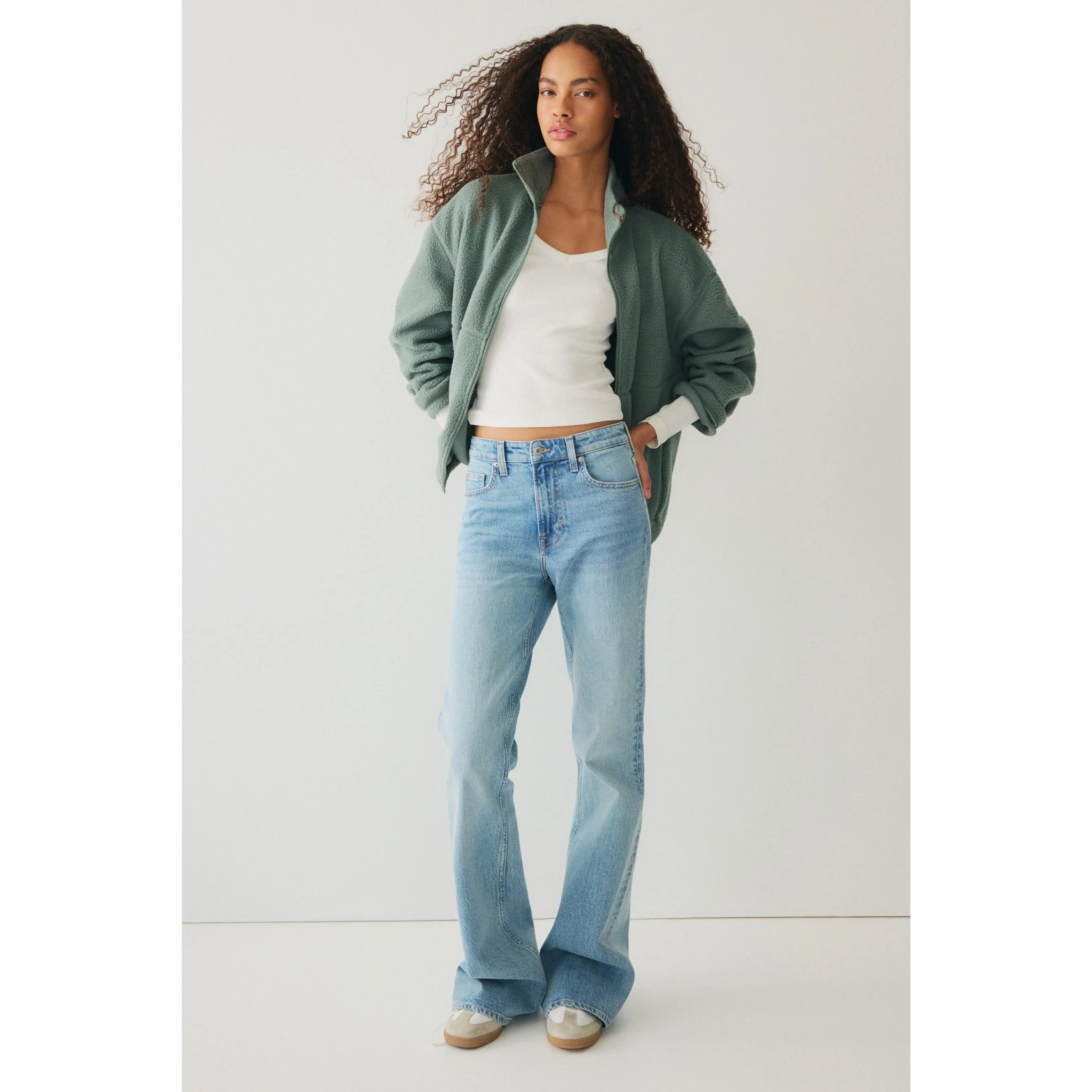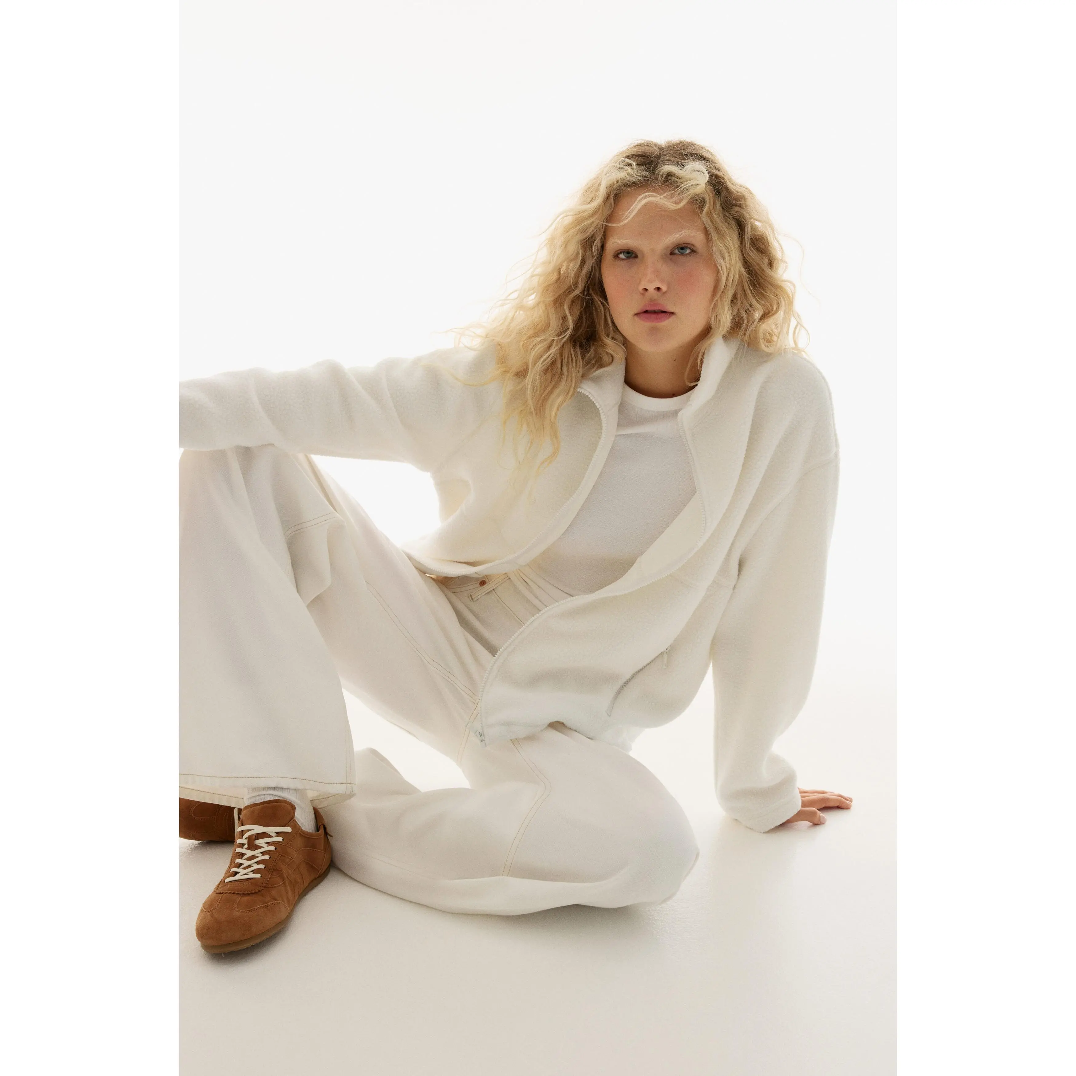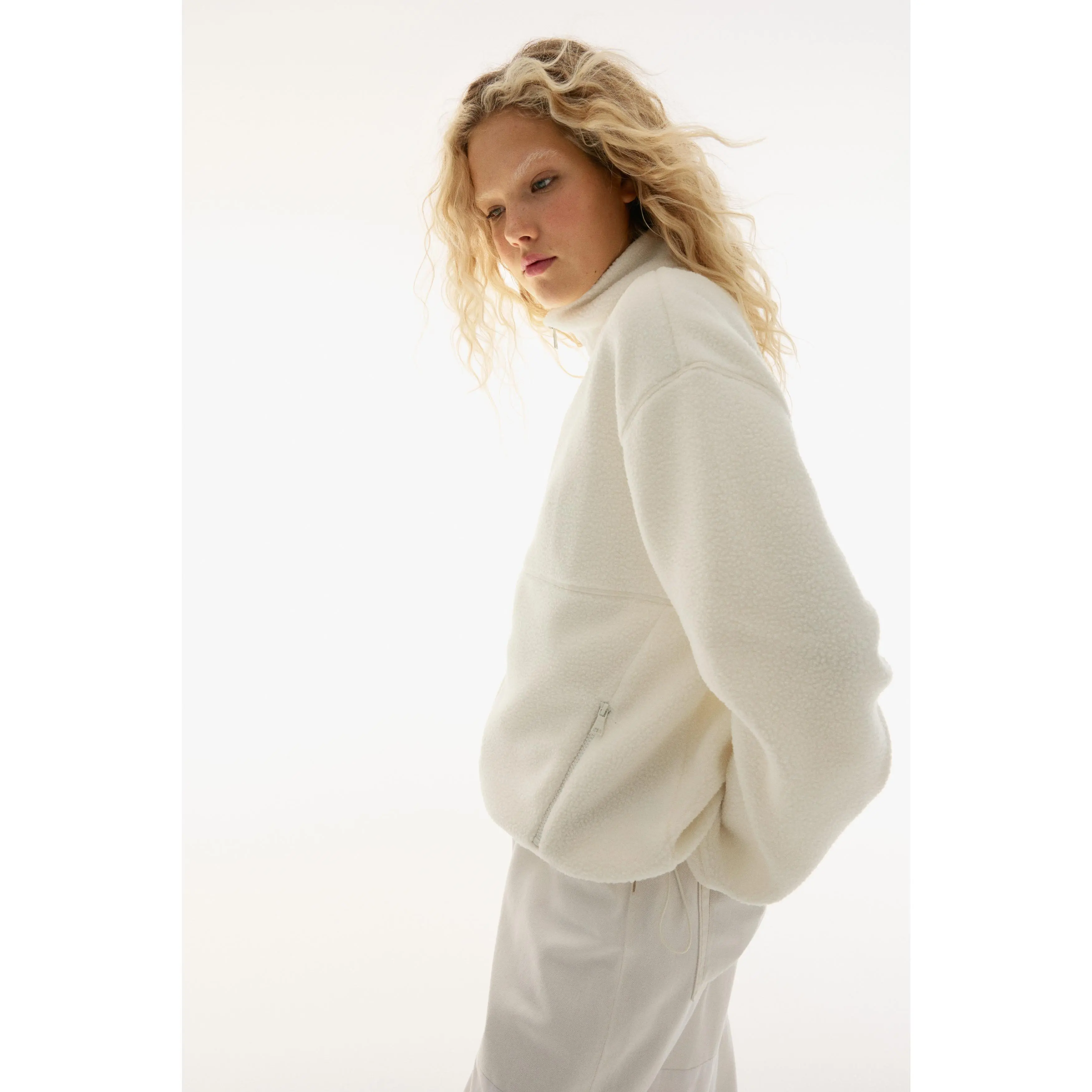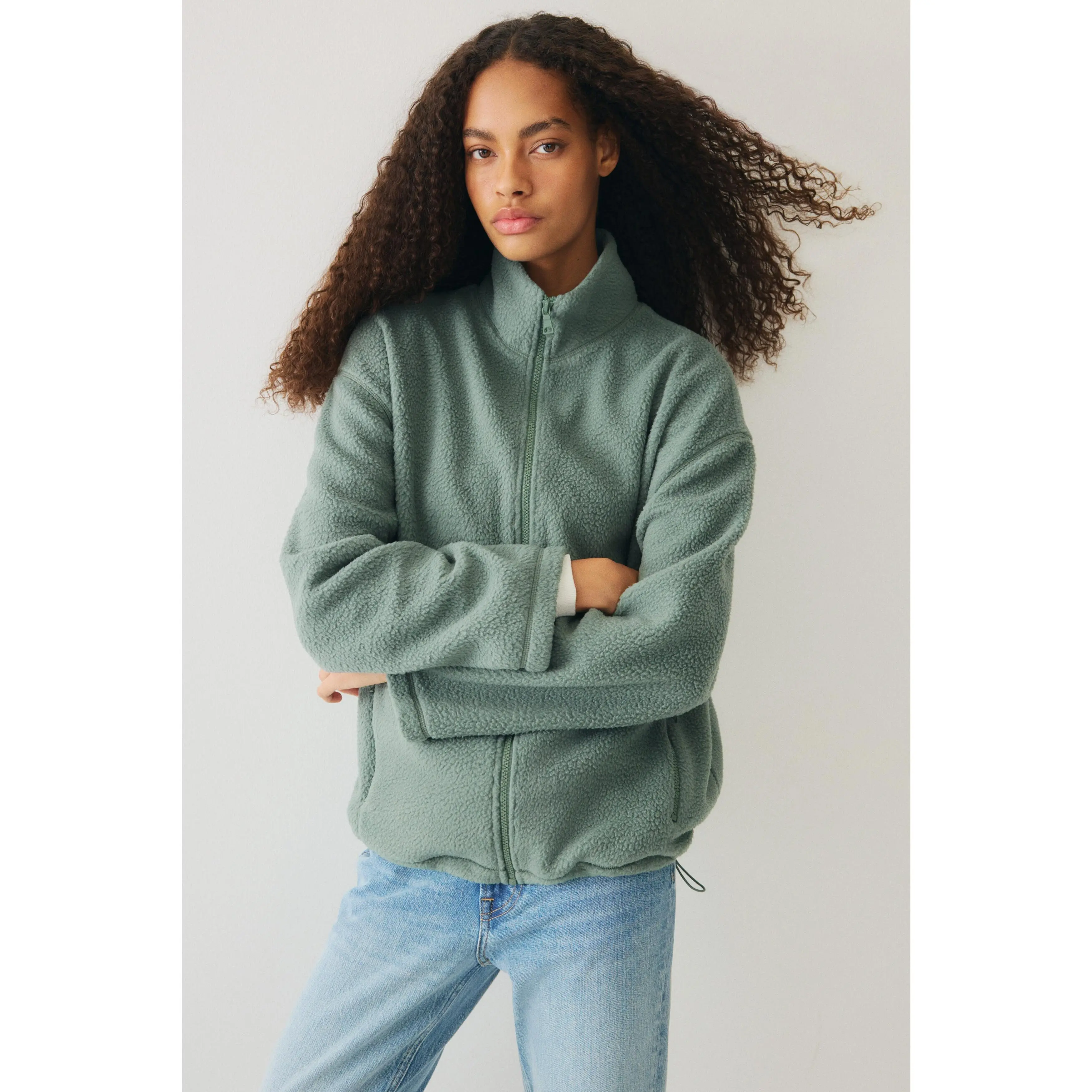 Oversized jacket in soft teddy with a stand collar, zip down the front and zipped side pockets. Dropped shoulders, long sleeves and a drawstring at the hem for an adjustable fit. Unlined.