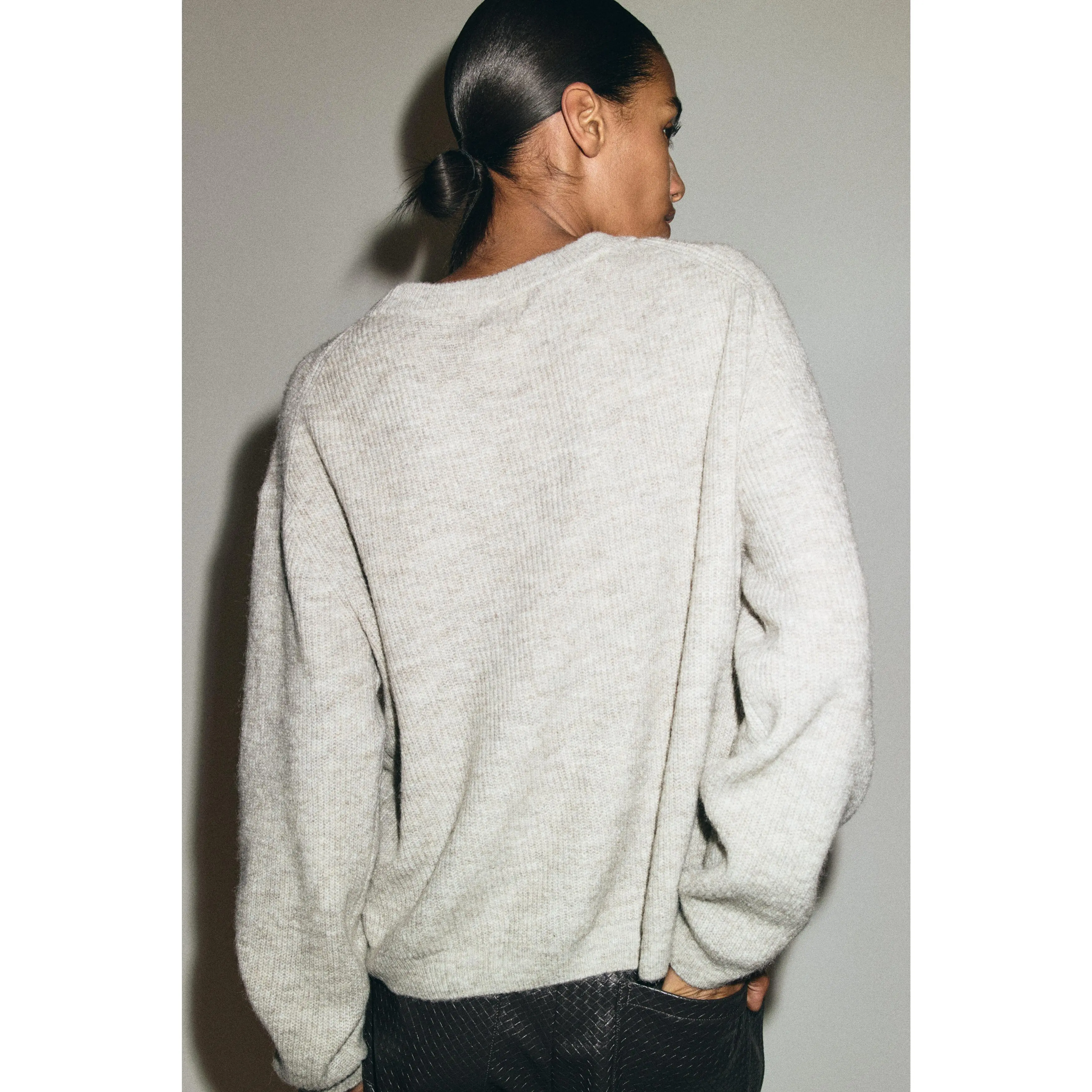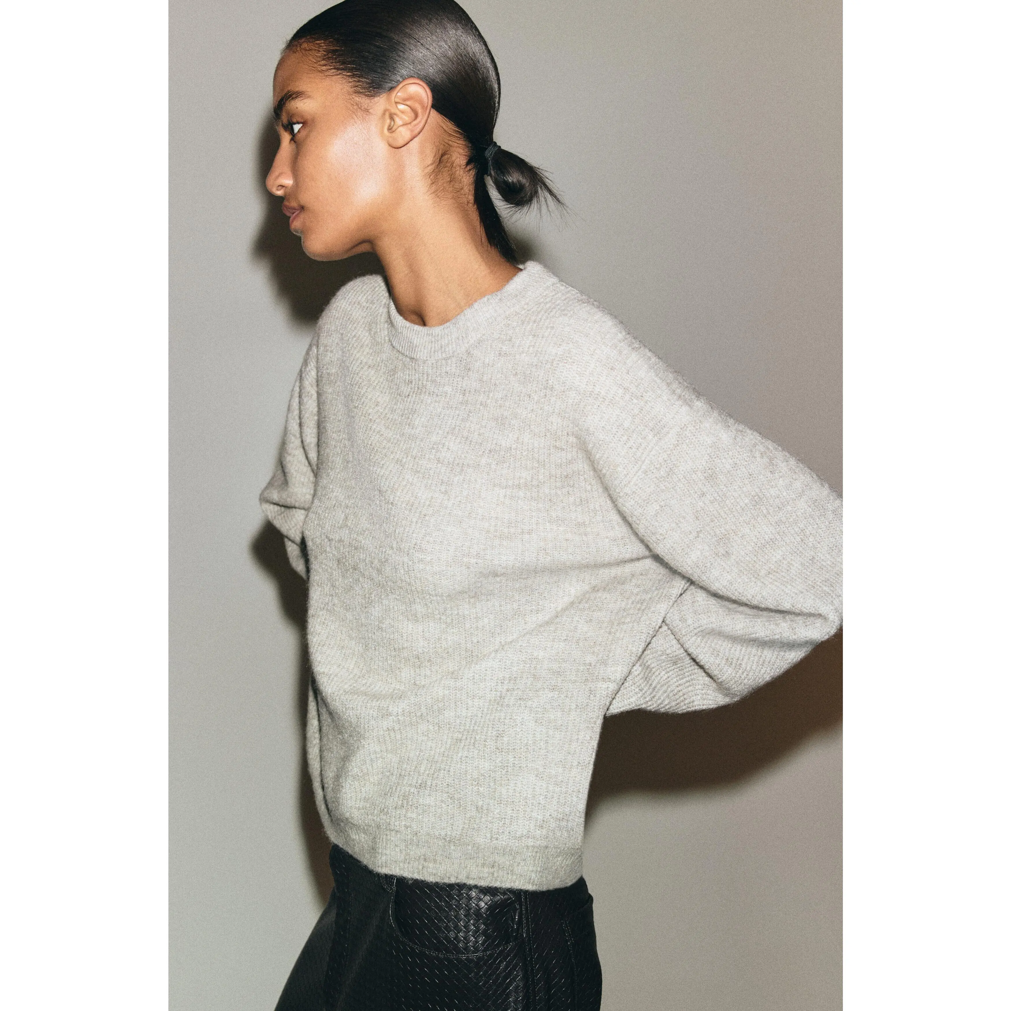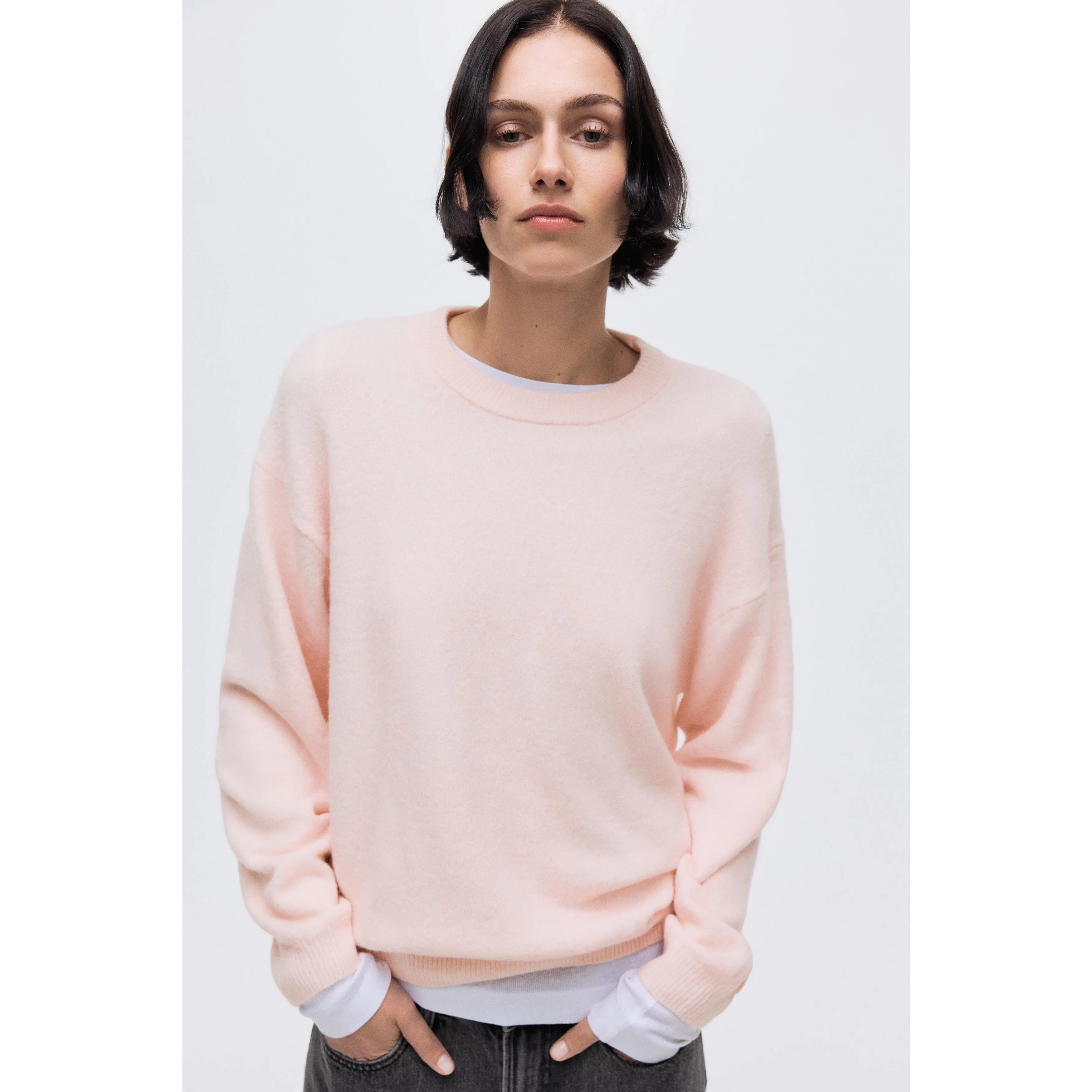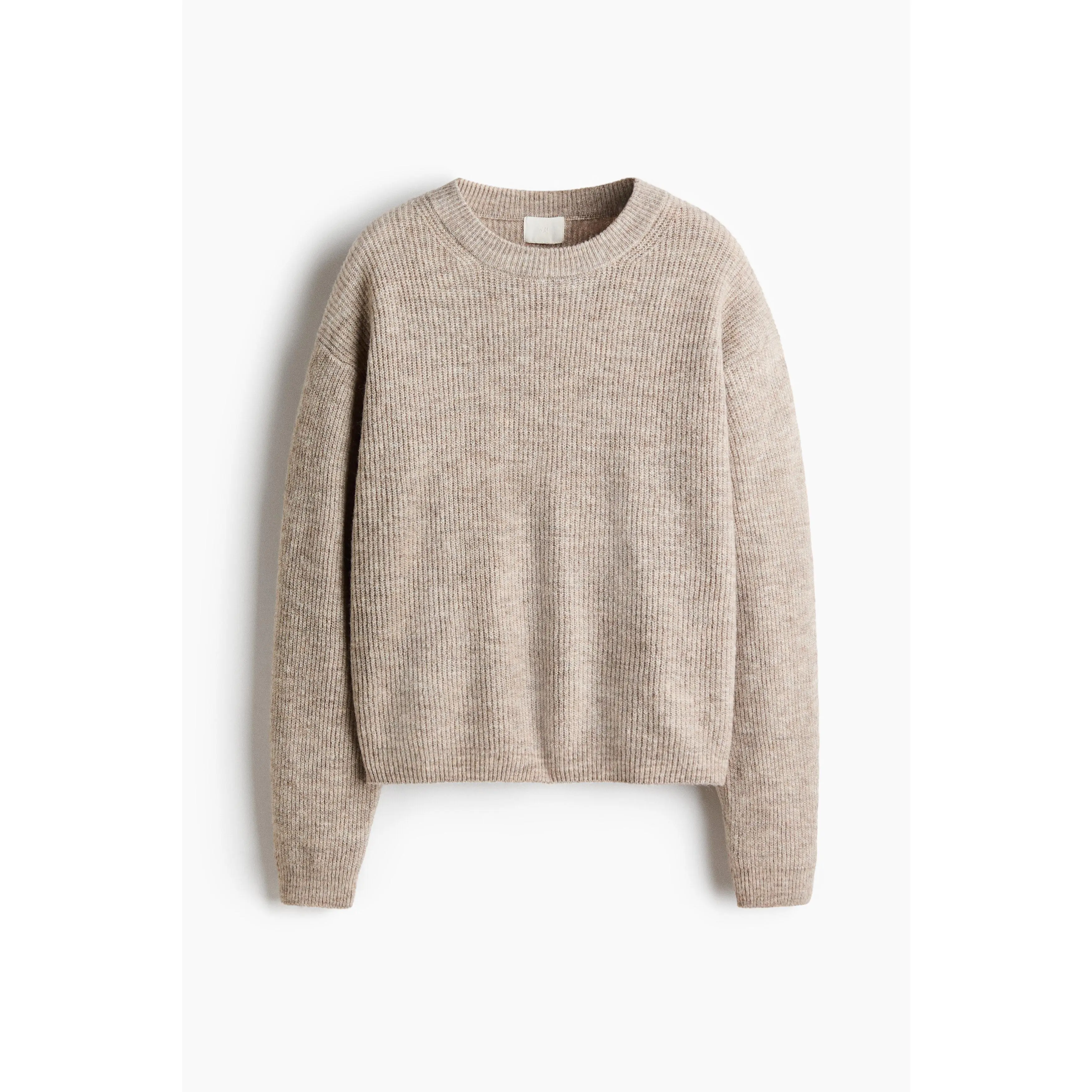 Jumper in a soft knit containing some wool with a round, rib-trimmed neckline, dropped shoulders, long sleeves and ribbing at the cuffs and hem.
