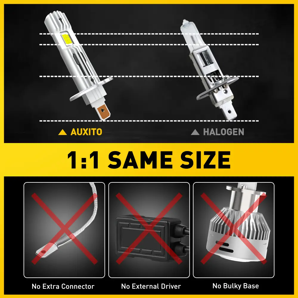 1:1 mini size as original halogen bulbs for higher compatibility and simple installation.