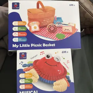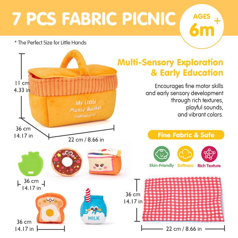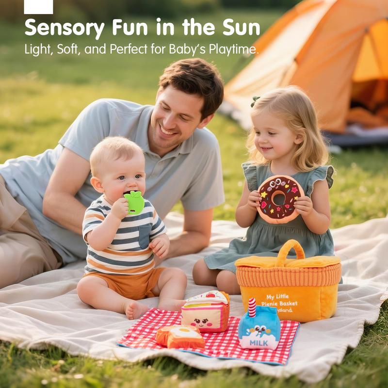 My First Plush Picnic Toy Set: This soft baby toy set features a plush picnic baskets and 6 sensory toys, perfectly sized for tiny hands to grasp, squeeze, and explore. With vibrant colors and playful textures, it keeps babies engaged while supporting focus and sensory development. A perfect Montessori toy for babies 6–12 months.