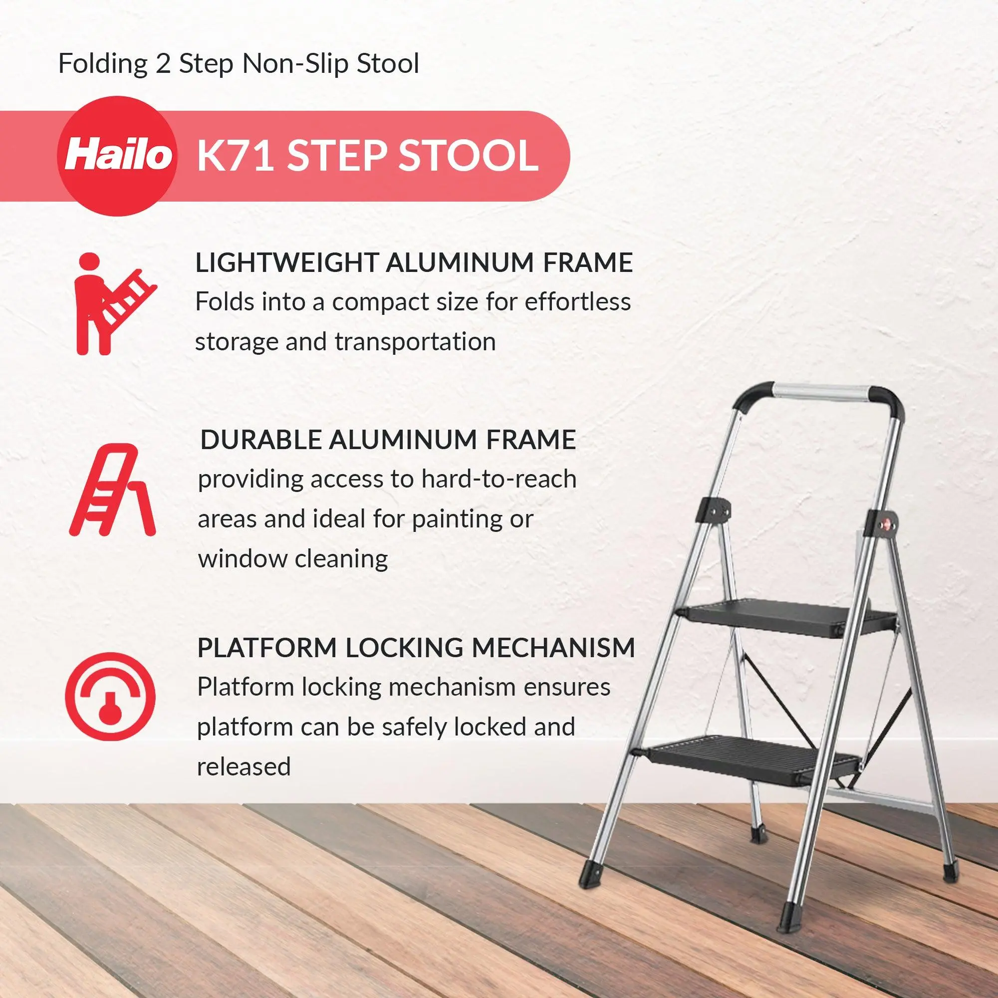 Reach those hard-to-get places and do it with confidence using the Hailo K71 Step Stool. This stepstool is suitable for a variety of uses and has a sturdy construction that will last for many years.The frame of the foldable step stool is made from aluminum for robustness and reliability. The individual steps are also made from aluminum with a large surface area that is covered with textured, non-slip mats for added safety. The feet are covered with non-skid plastic and offer full-surface contact, factors that provide maximum stability and help to ensure that the stepstool won’t slip out from under you while you work. Holding a maximum weight of 225 pounds, this ladder stand is perfect for use in or outside of your home. With its compact design, you can use it as an attic ladder to retrieve seasonal essentials, as a garage stool to reach top-shelf tools or equipment, or as a kitchen step stool to help you clean the top of your refrigerator. Simply unfold the ladder and it'll stay unfolded thanks to the folding lock with safety catch, and the integrated handle provides additional stability when going up and down the ladder. When you're finished, this ladder has a handy fold-down feature with a narrow width of only 3 inches, making it easy to store and transport.Whenever you need a lift, this Step Stool from Hailo is your go-to companion.