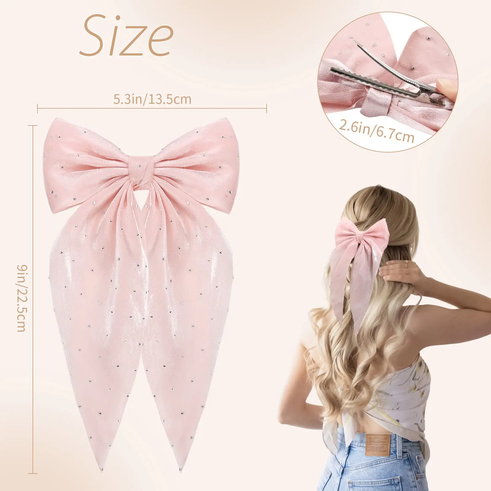 【PRODUCT SIZE】- Our rhinestone hair bows length is about 5.5 inches. The length of the clip is about 2.6 inches. large hair bows for girls is a great size to wear on the hair, satin hair bow clips is suitable for girls and women, Tulle bows will make you more beautiful and charming in any occasion.