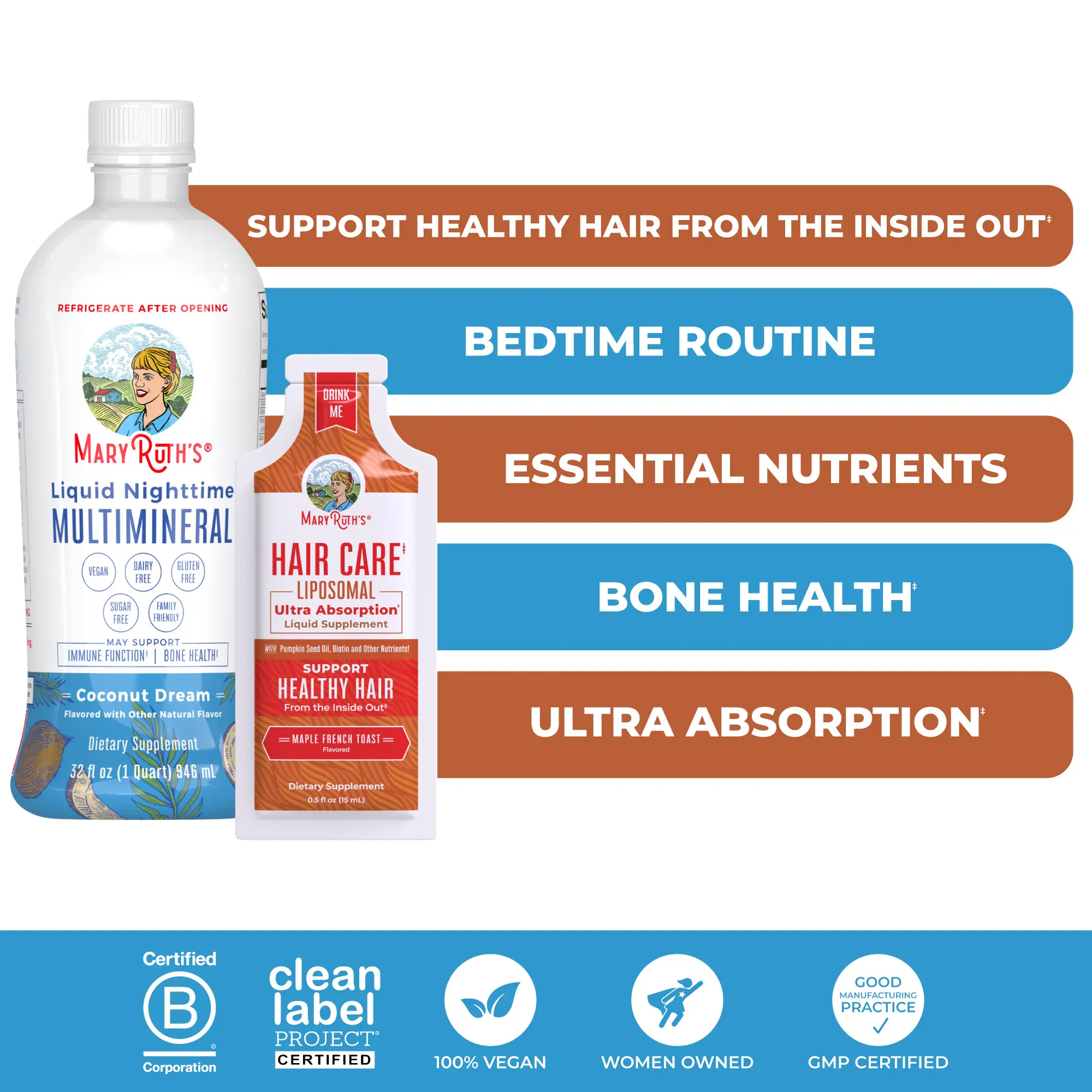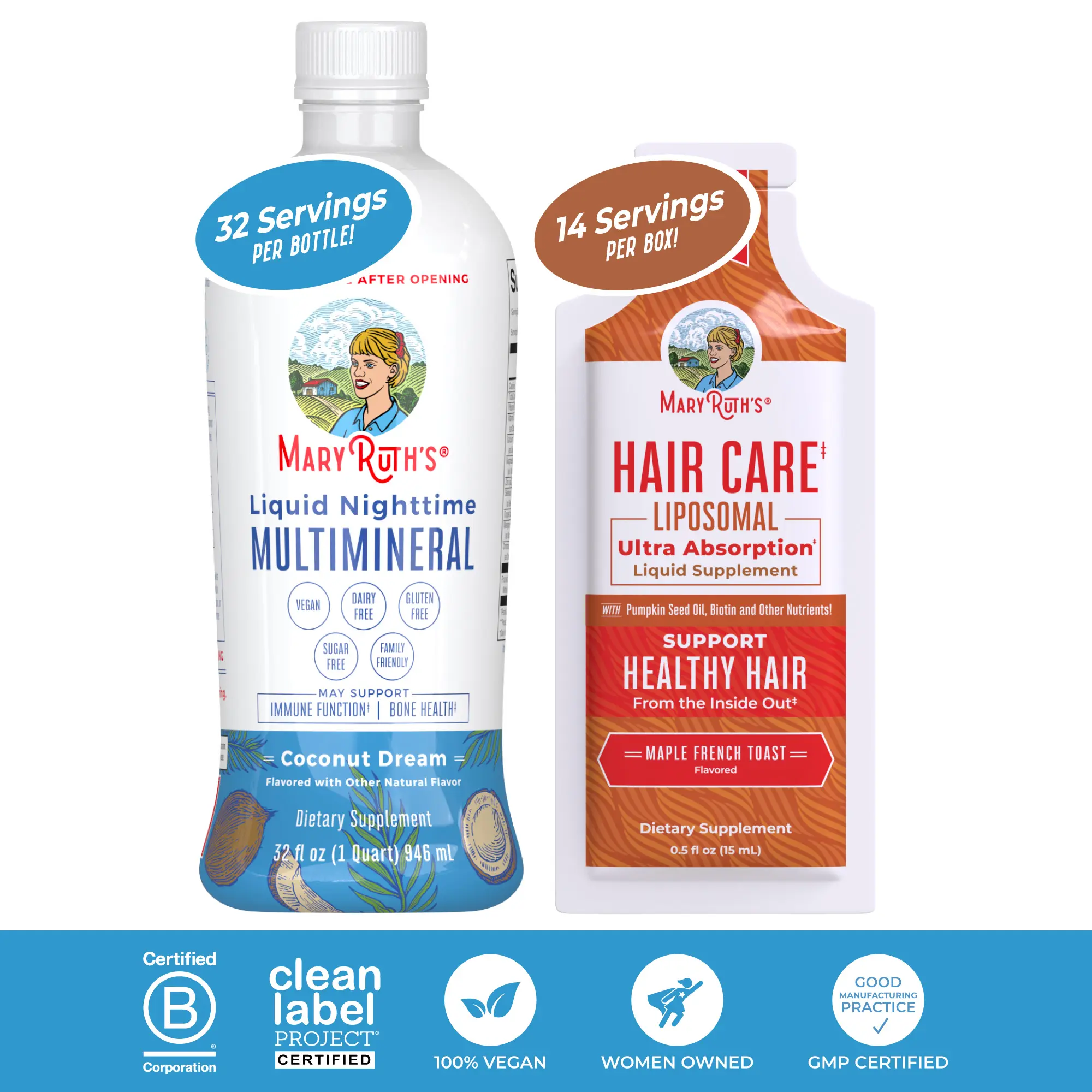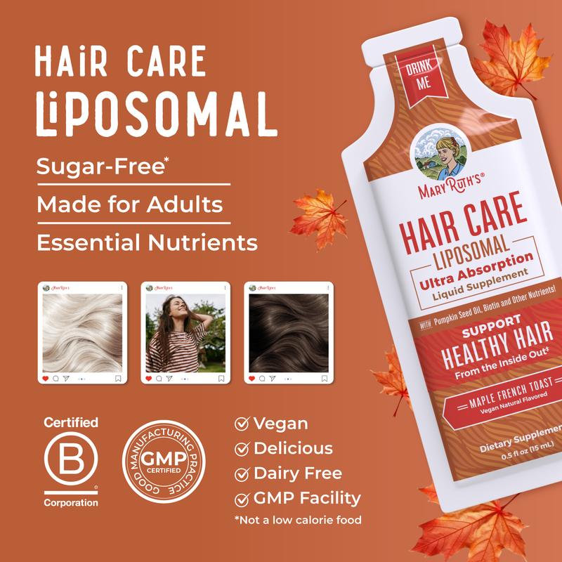 For Most Lifestyles: MaryRuth's Hair Care Liquid Liposomal is Non-GMO & vegan, made in a GMP (Good Manufacturing Practice) facility, dairy free, gluten free, soy free, Sugar Free* (*not a low calorie food). This product CONTAINS nut allergens: Almond. B Corp Certified.