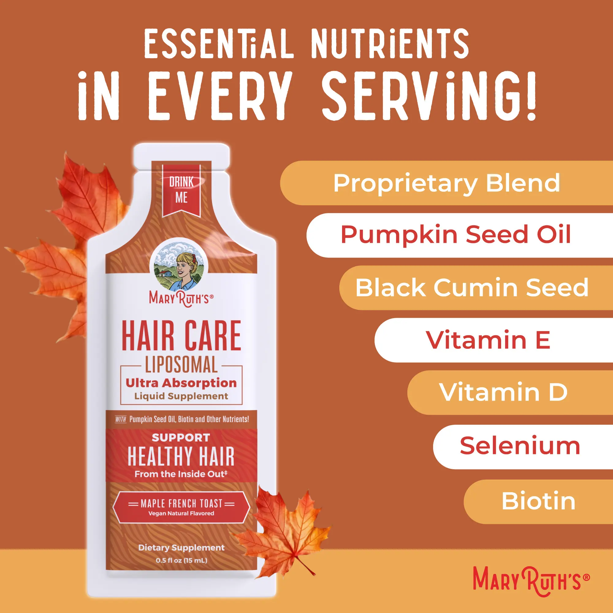Beauty From Within: Our Hair Care Liposomal is a blend of vitamins, botanicals, and more to help nourish your hair. Support your hair from the inside out with this delicious french toast flavored supplement, in easy single-serving packets to take at home or on the go!