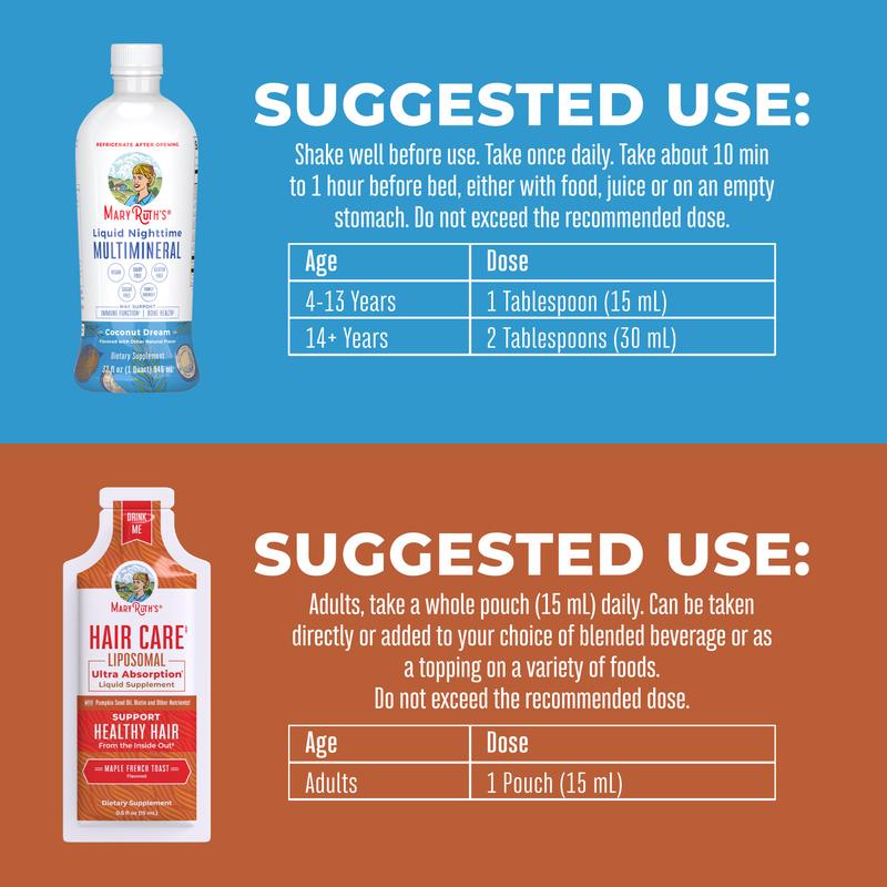Support healthy hair from the inside out as well as quality sleep each night with this bundle pairing of our Hair Care Liposomal and Liquid Nighttime Multimineral!