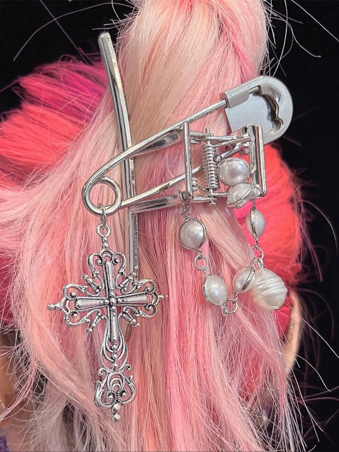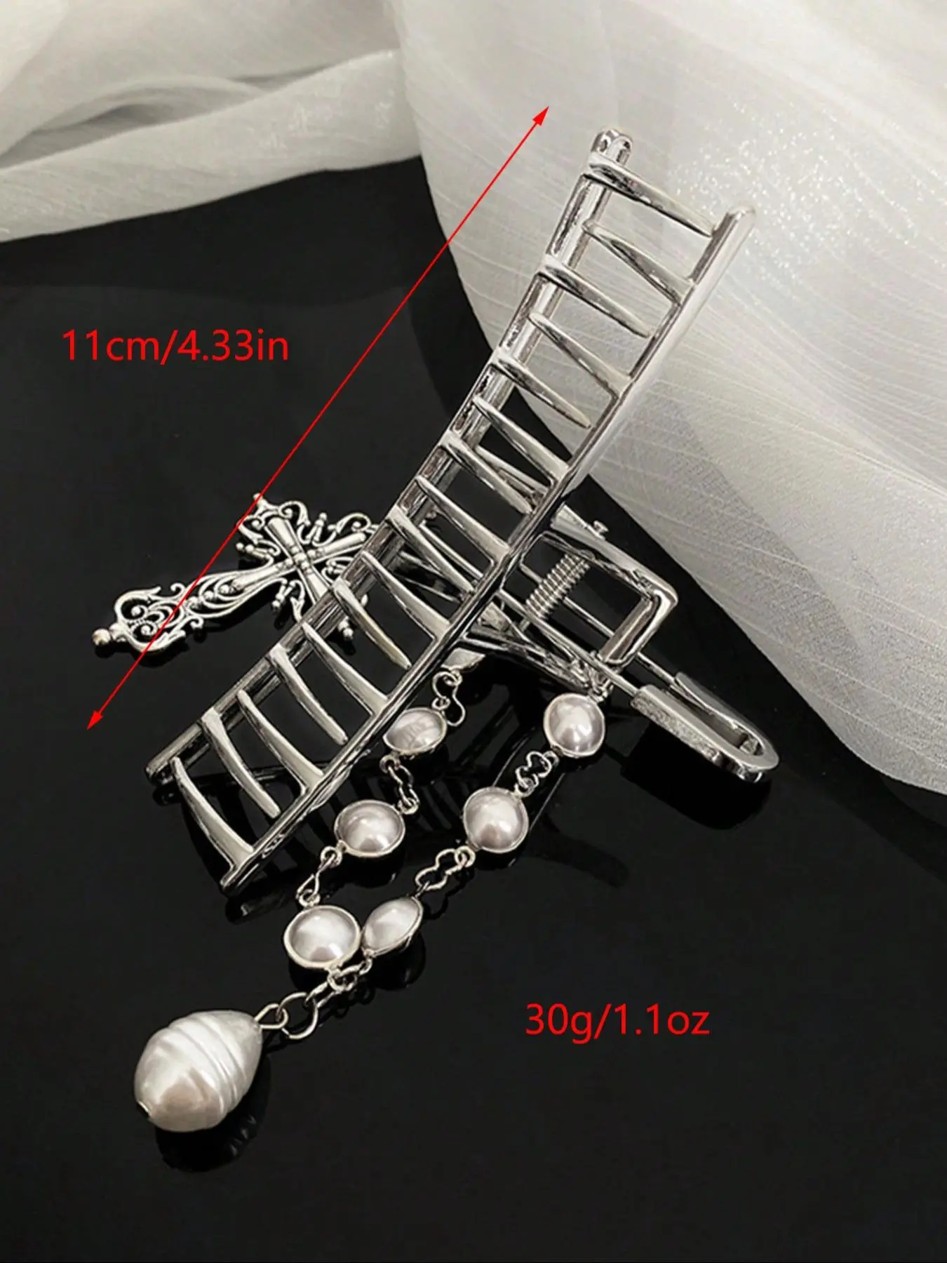 Faux Pearl & Chain Decorated Hair Claw, Hair Clip, Hairpin, Y2K Punk Style Hollow Out Design Hair Accessories for Women & Girls, Vintage Hair Accessories for Daily Wear
