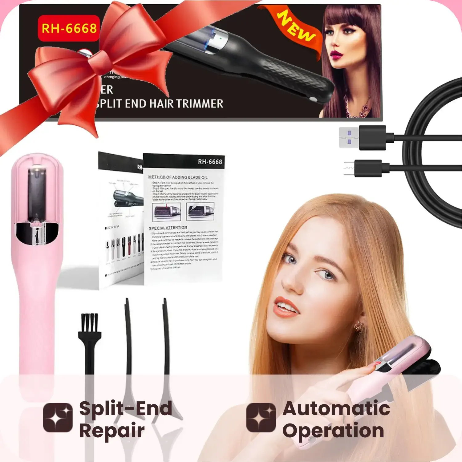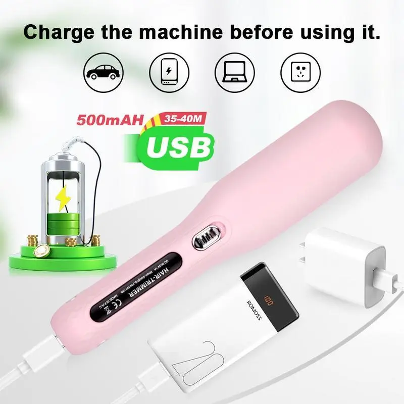 My friend got one and it made me want to get one. So great, I love it! Came charged already. And comes with usb-c charger, two hair clips and little brush. Don’t need to do whole strip of hair, just the ends. Best used if you do piece by piece. Easily dispose of trimmed hair