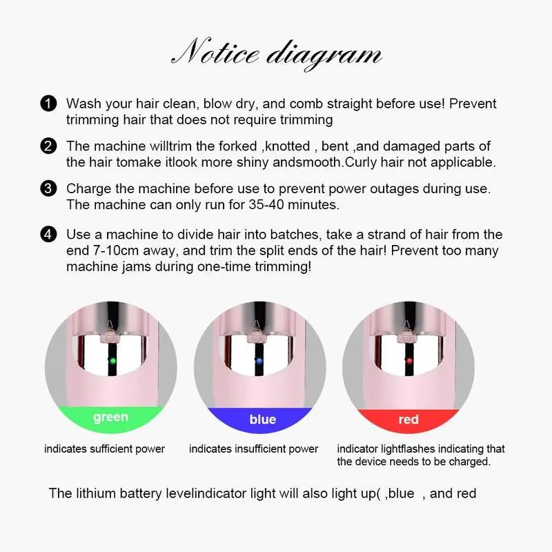 It is not a split end trimmer it is just a trimmer. Yes, it does work. Think of it as a hair cutter like clippers. It turns green when it is fully charged. It also has a lock.