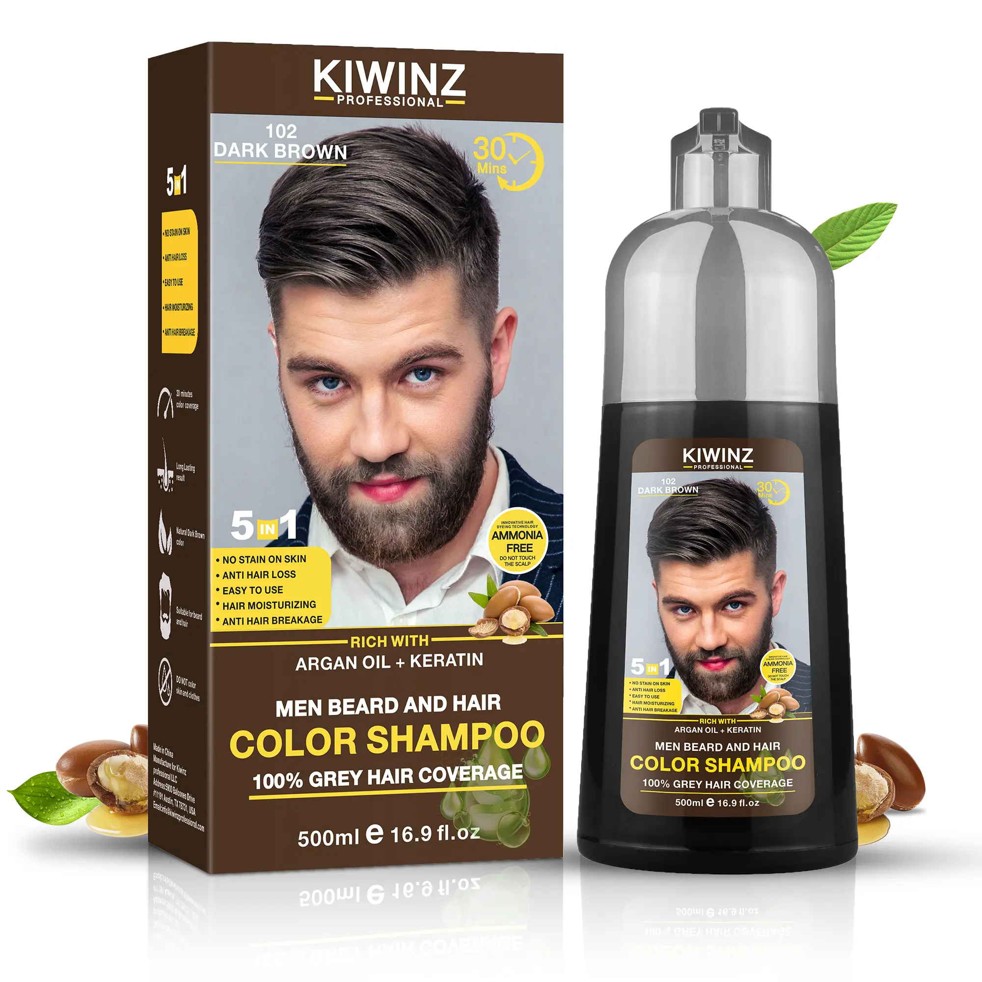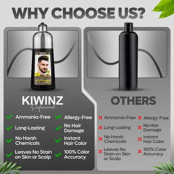Transform your hair care routine with KIWINZ PRO 5-in-1 Men's Beard & Hair Dye Color Shampoo. This innovative formula combines the power of Argan oil and Keratin. It's designed to moisturize and prevent hair breakage, ensuring your locks stay healthy. The unique 5-in-1 formula is perfect for men looking to enhance their hair color.
