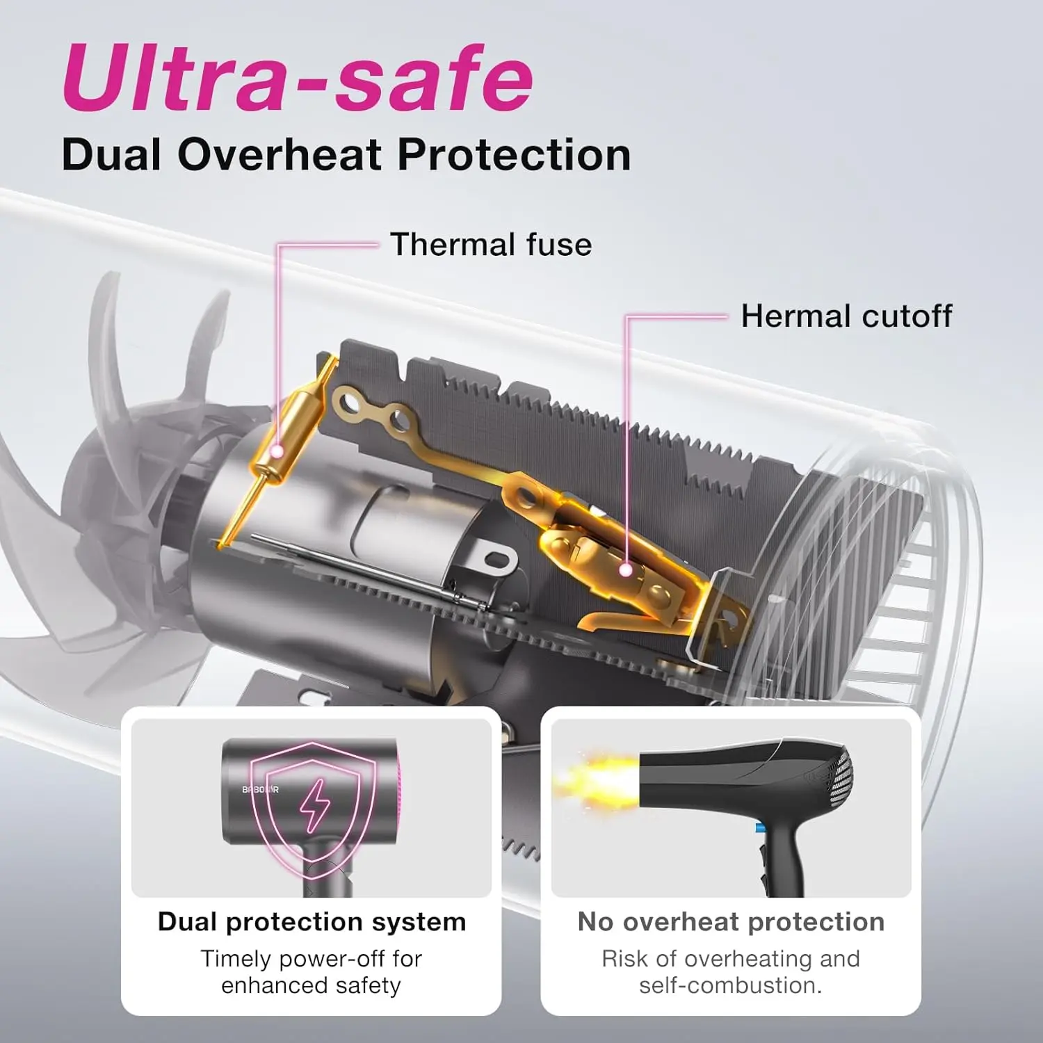 ·[3 Heat/2 Speed Settings] With 3 temperature settings (cool/warm/hot) and two airflow speeds (including a cold air option) , this blow dryer offers customizable versatility for every hair type, turning your hair care routine into a relaxed, salon-worthy experience.Tips: its low electromagnetic wave technology reduces radiation by 50%, making it a safer choice for pregnant women and children