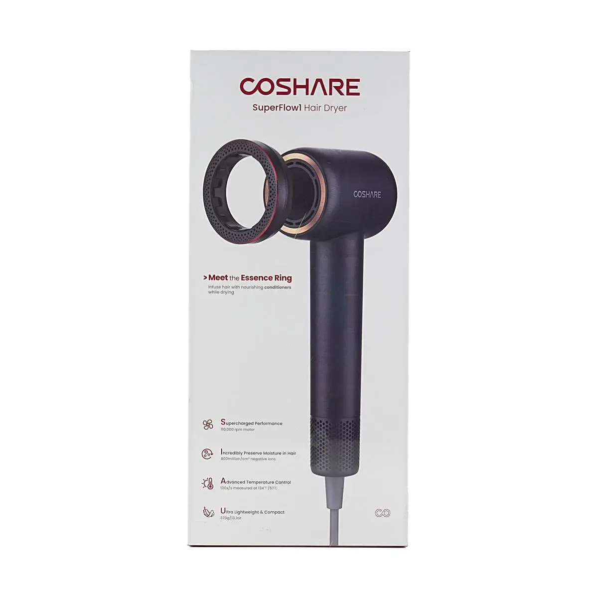 COSHARE Fast Drying Hair Dryer, SuperFlow1 Essence Oil Ring Blow Dryer for Health Scaple and Less Frizzy, High Negative Ions, Lightweight, HD10U Black
