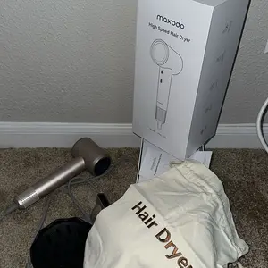 The Maxodo High-Speed Hair Dryer provides a salon-quality drying experience with its brushless motor featuring 110,000 rpm for strong airflow. This ensures a fast drying experience, significantly reducing drying time. Made from Acrylonitrile Butadiene Styrene Polycarbonate, it is powered by 1400 watts with an electrical power cord.