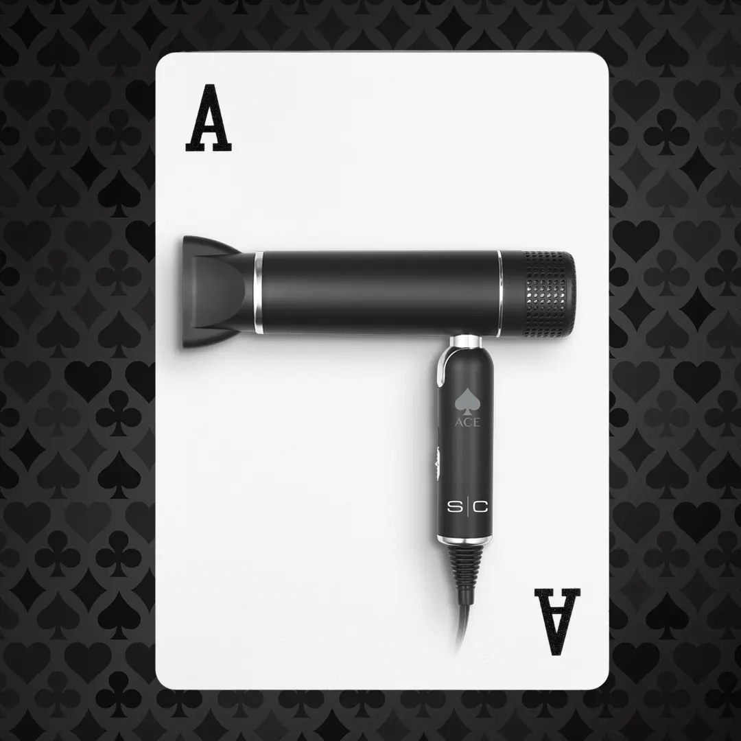 The StyleCraft Ace Hair Dryer boasts a sleek, professional finish with a matte black and silver metallic design. This modern look ensures a sophisticated feel, impressing at first glance. The compact size and foldable handle make it easy to store and travel with. Perfect for both home and salon use, this dryer combines style with functionality.