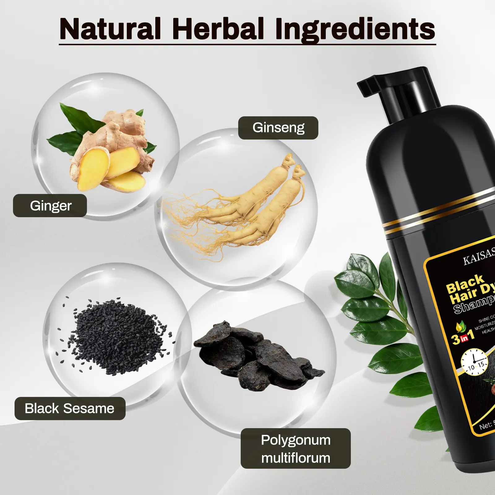 Polygonum multiflorum strengthens hair roots, making them robust and soft. Ginseng extract nourish hair, ensuring long-lasting color without damage. This natural formula balances beauty and health, restoring youthful hair with added shine. It complements gray hair, enhancing its health.