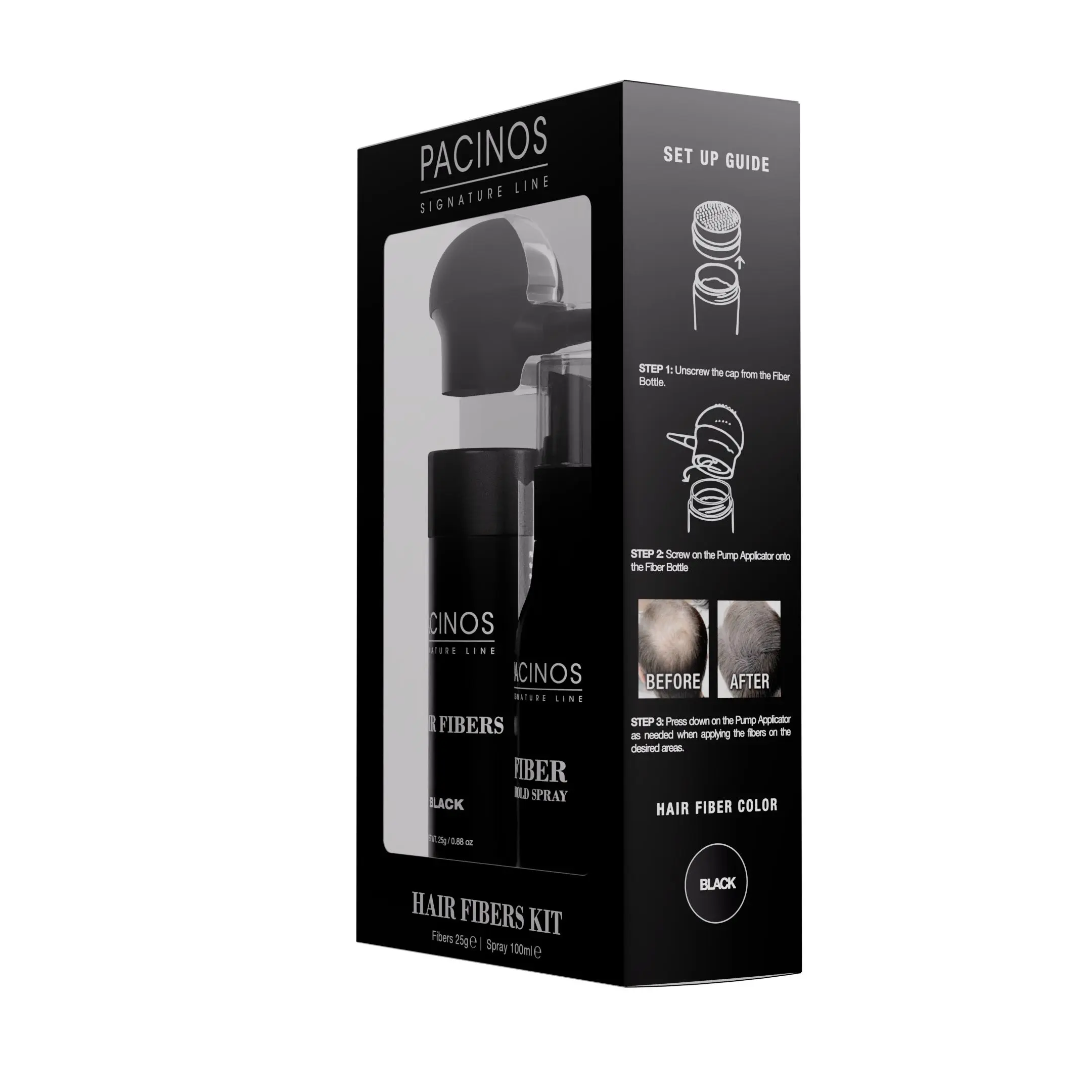 Wash, fully dry, and style hair as usual. Shake fibers over desired areas and pat gently to set in place. For best performance, apply our Pacinos Freeze Spray to lock in the look for an all-day hold.