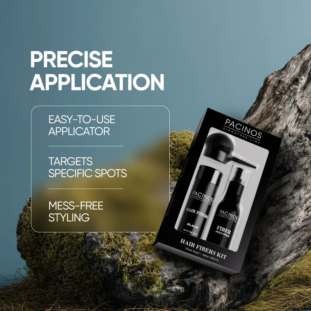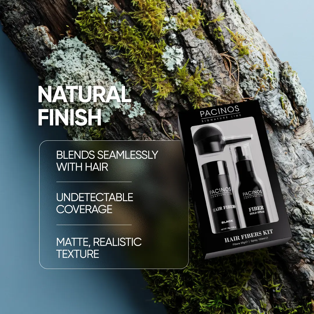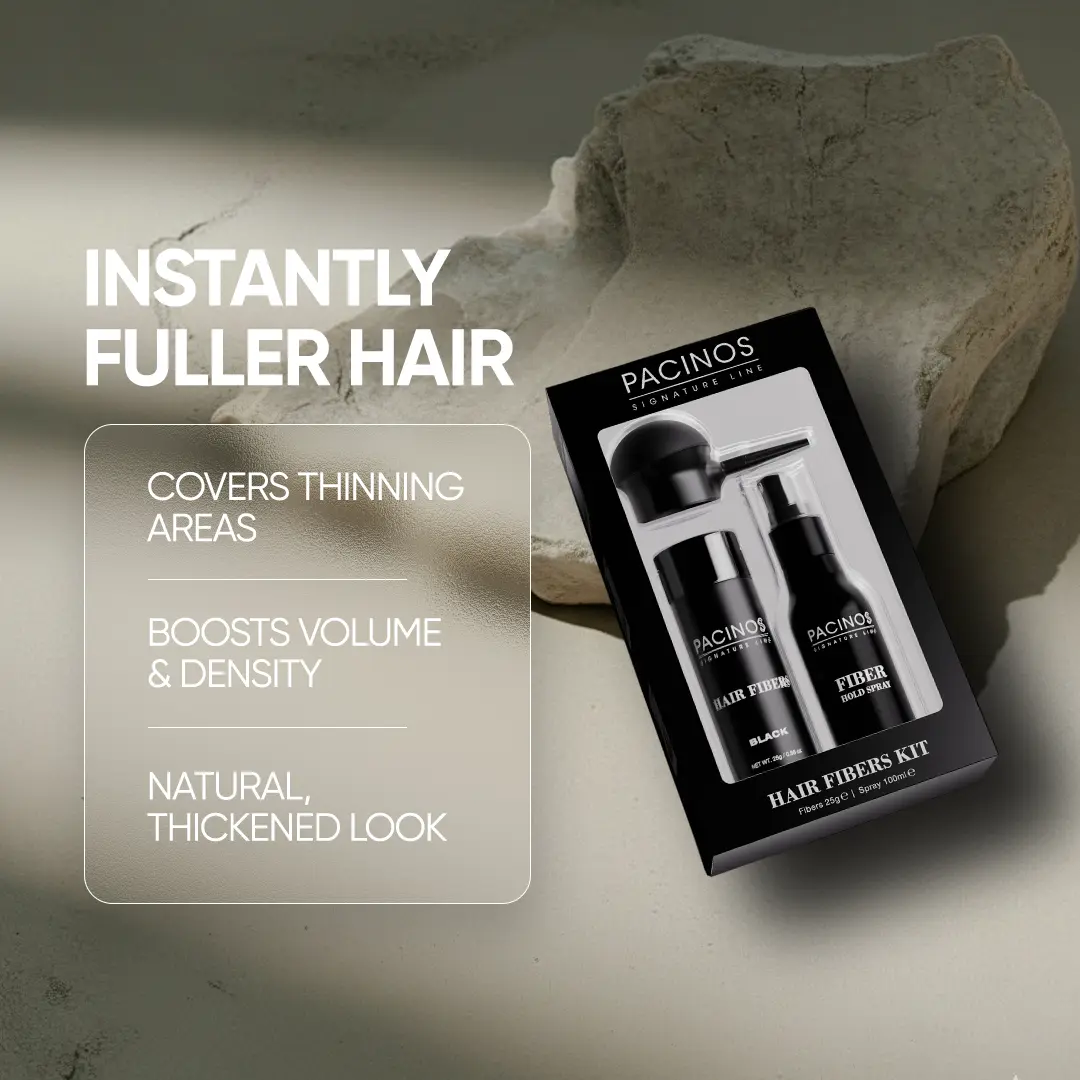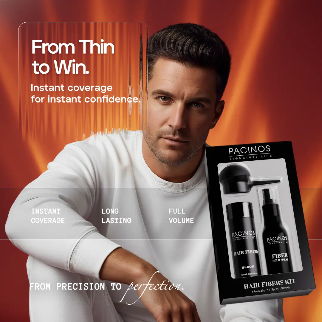 Pacinos Hair Fibers are a revolutionary hair loss solution that instantly conceals thinning hair and bald spots. These tiny, keratin-based fibers electrostatically bond to your existing hair, creating a natural, fuller appearance.