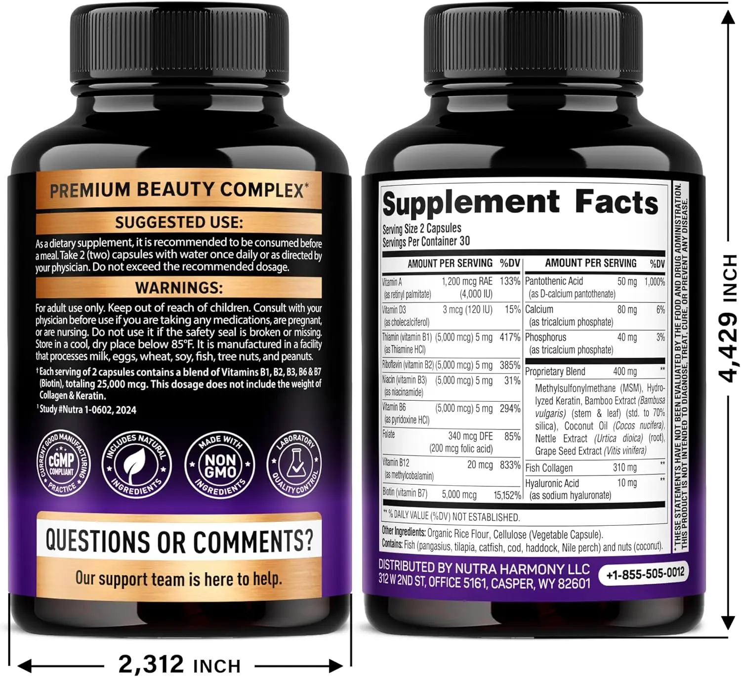 Vitamin A, Vitamin D3, Thiamin, Riboflavin, Niacin, Vitamin B6, Folate, Vitamin B12, Biotin, Pantothenic Acid, Calcium, Phosphorus, Proprietary Blend (Methylsulfonylmethane (MSM), Hydrolyzed Keratin, Bamboo Extract, Coconut Oil, Nettle Extract, Grape Seed Extract, Fish Collagen, Hyaluronic Acid). The term "Beauty Complex" represents vitamins B2, B3, B6 and B7 (Biotin)