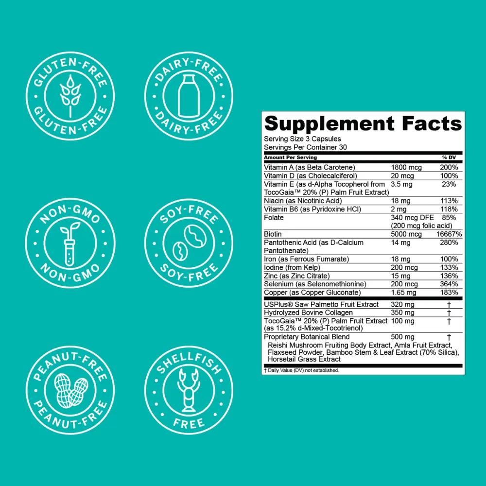 🌿 Contains 5000mcg Biotin, hydrolyzed bovine collagen, and folate. These nutrients support overall health. Zinc, vitamins A & D3, selenium, iron, and reishi mushroom are chosen for their benefits. They help keep you healthy from within, promoting healthy hair.