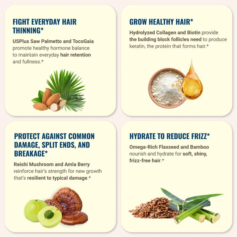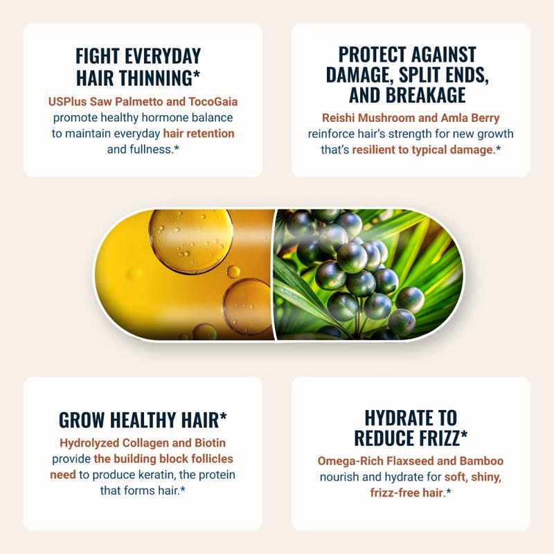 ✨ Supports healthy, strong, thick-looking hair. Genetics play a role, but nutrition aids hair health. Our formula uses total body nutrition to promote healthy hair. It works with your body to target common hair issues from various angles.