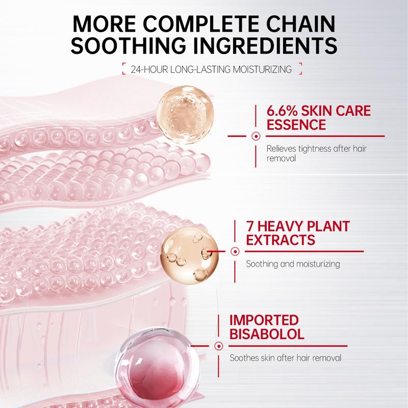 ·[Soothing Ingredients] Free from alcohol, pigments, hormones, heavy metals, and fluorescent agents, this hair removal cream is enriched with 6.6% skin care essence, plant extracts, and imported bisabolol. It soothes, moisturizes, and relieves tightness, leaving skin smooth, hydrated, and irritation-free.