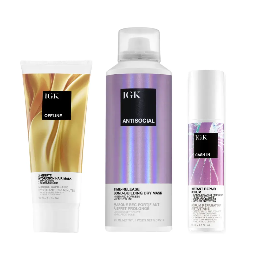 IGK ULTIMATE HAIR REPAIR BUNDLE | Cash In Repair Serum + Antisocial Dry Hair Mask + Offline Hydration Mask