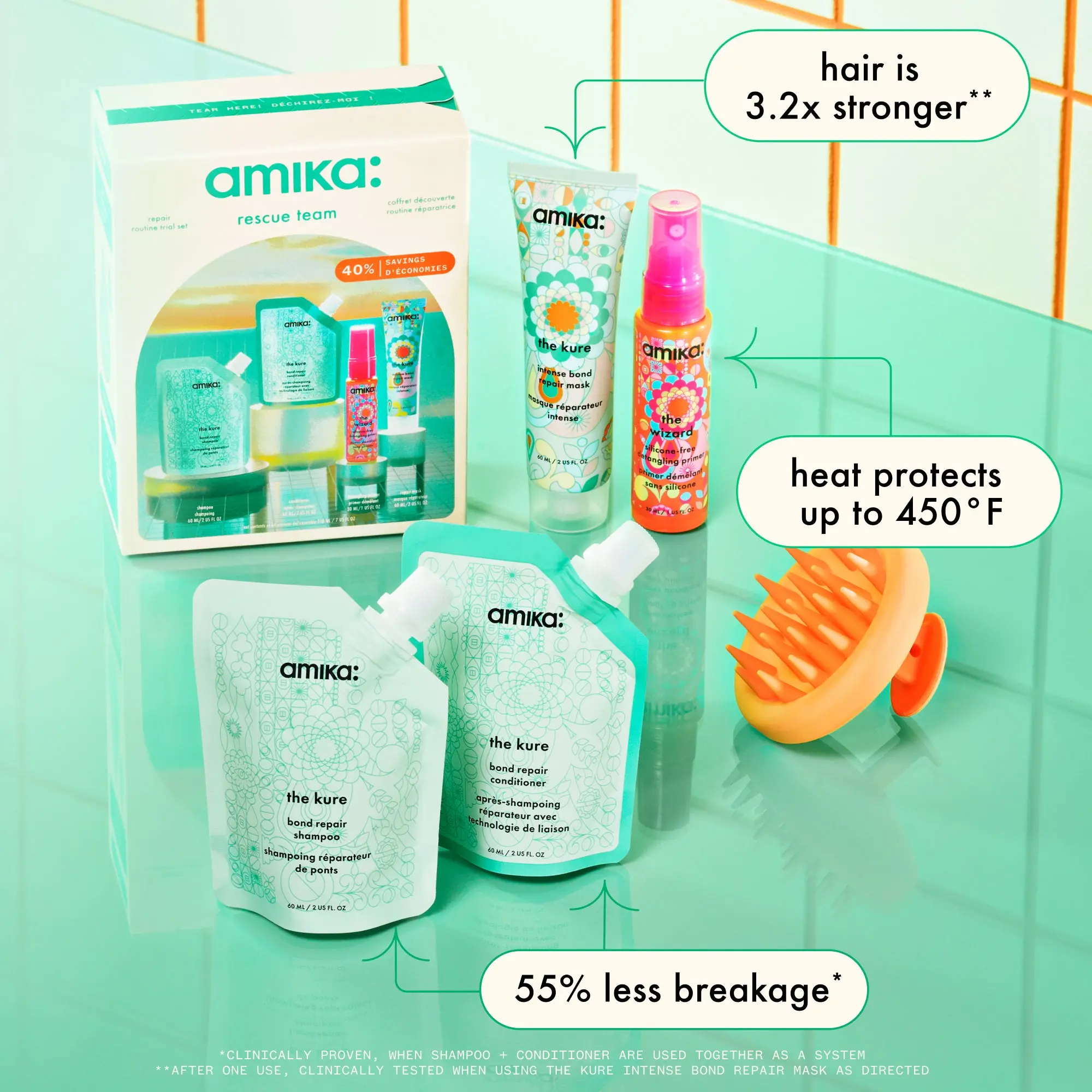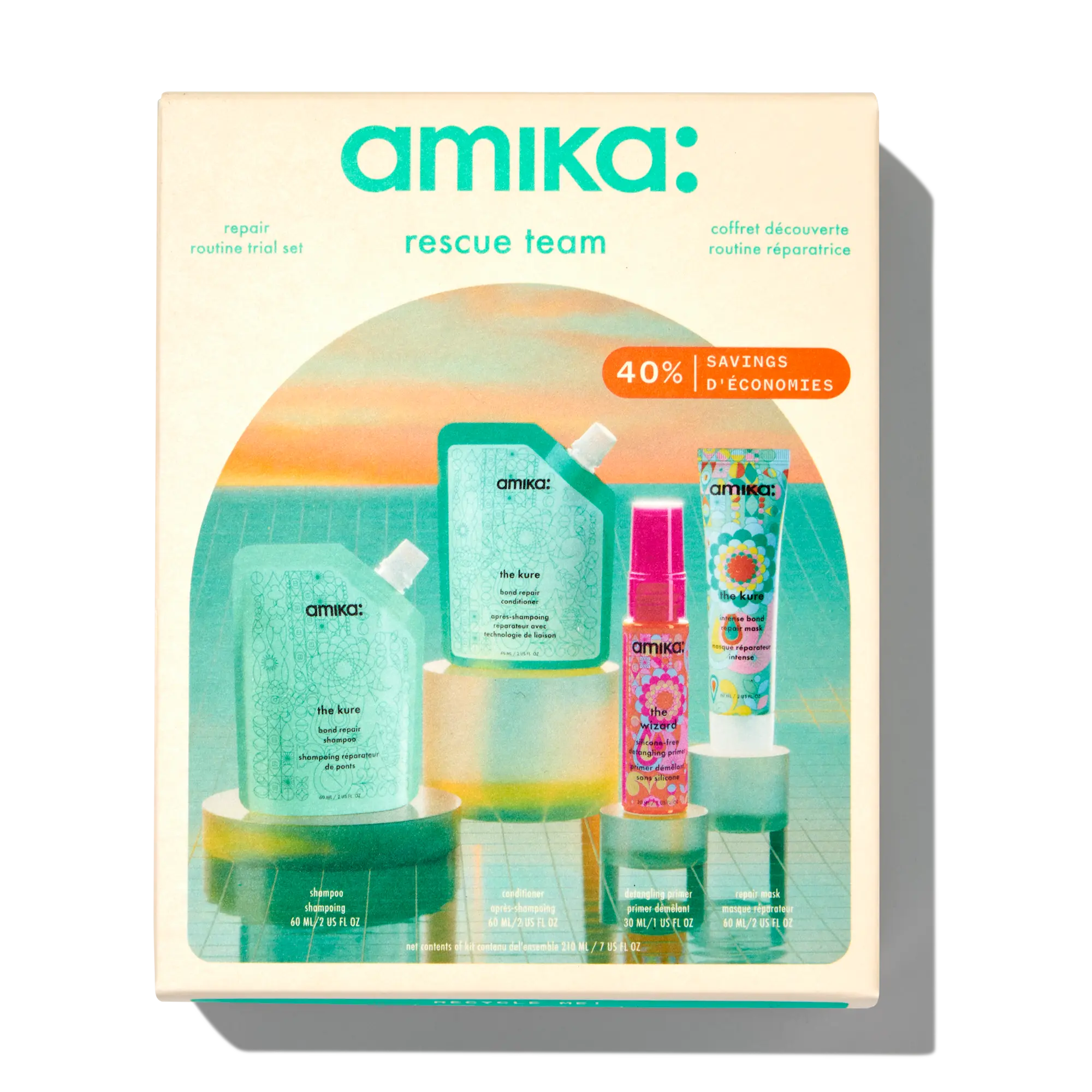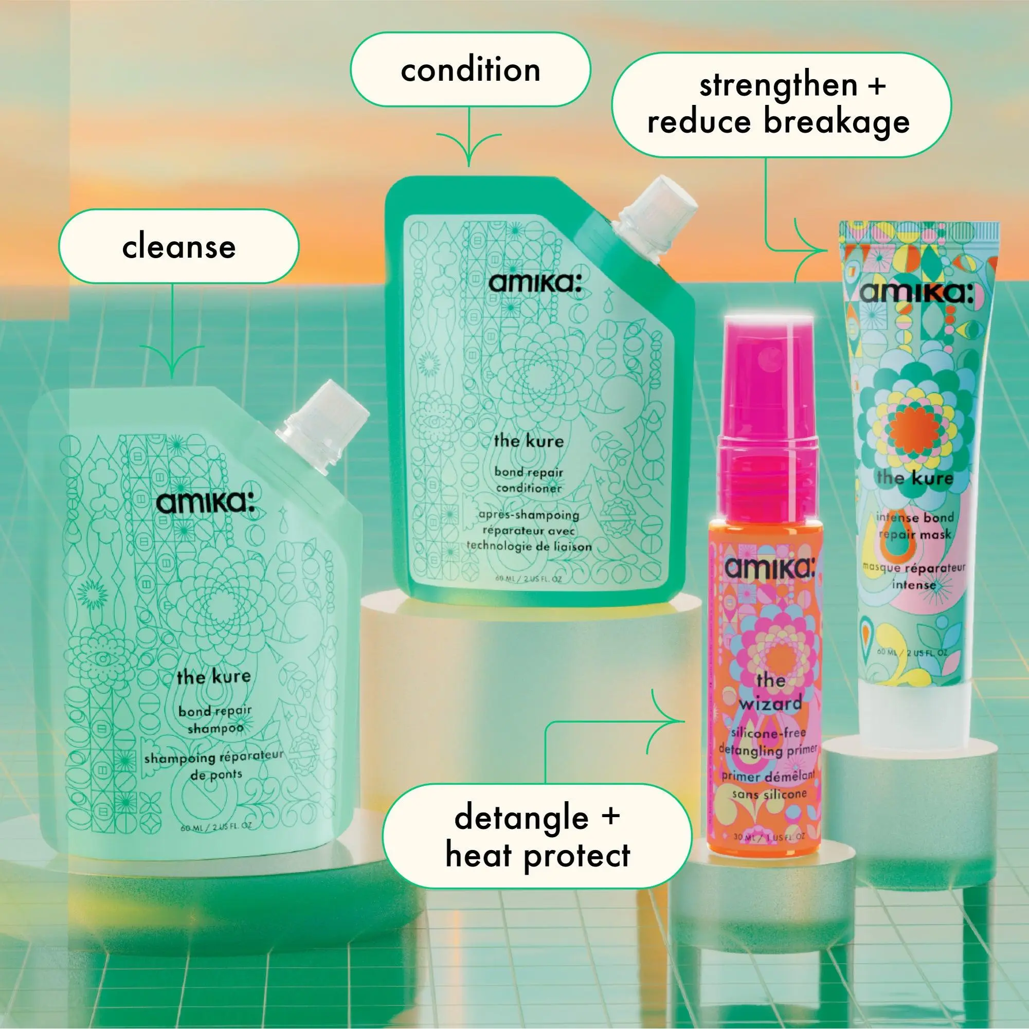in need of a new haircare routine? try this giftset, including mini refill pouches of the kure bond repair shampoo + conditioner, and trial sizes of the wizard silicone-free + the kure intense bond repair mask.