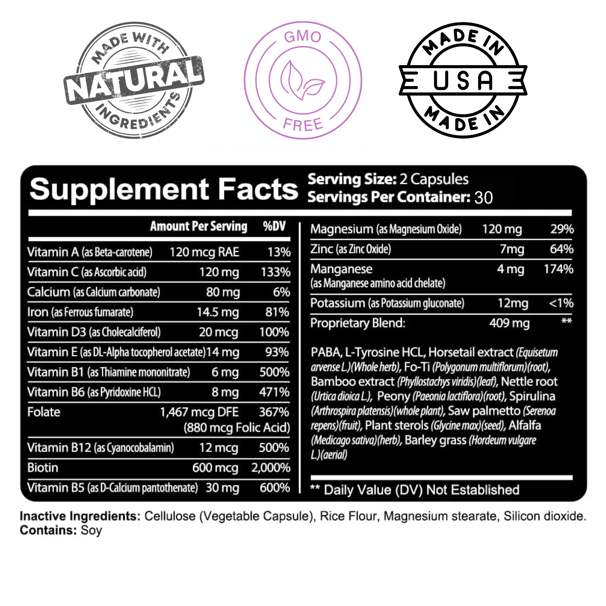 ·️Provide Nutrients to Your Hair from within with our cruelty-free capsule hair vitamins, including Vitamin A, Vitamin C, Vitamin D, Vitamin E, Vitamin B-6, Folic Acid, Vitamin B-12, Biotin, and Zinc as the active vitamins and minerals