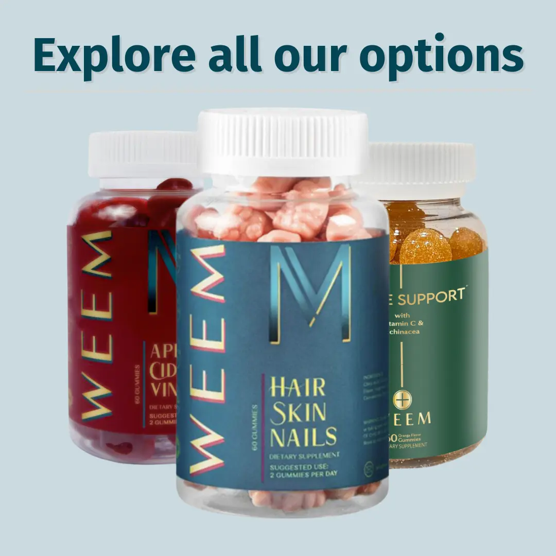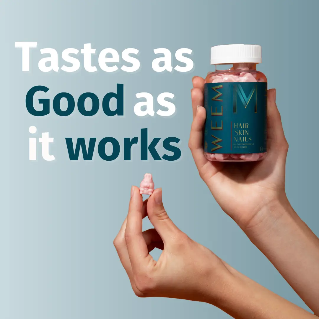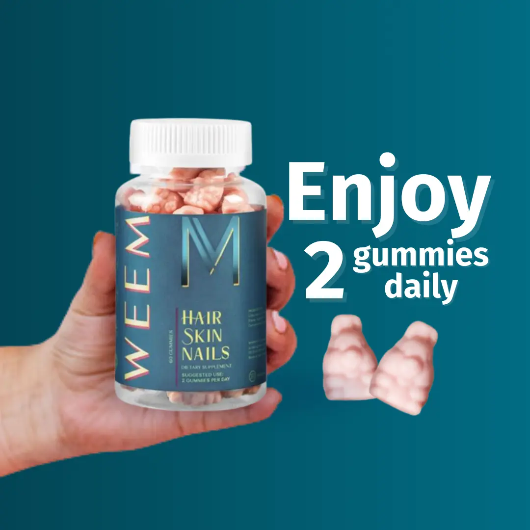 WEEM Gummies are specially formulated to promote collagen production and boost your natural beauty with a potent blend of antioxidants, fatty acids, and vitamins that help your hair, nails, and skin stay strong, healthy, and vibrant. Just 1 gummy twice a day makes a visible difference!