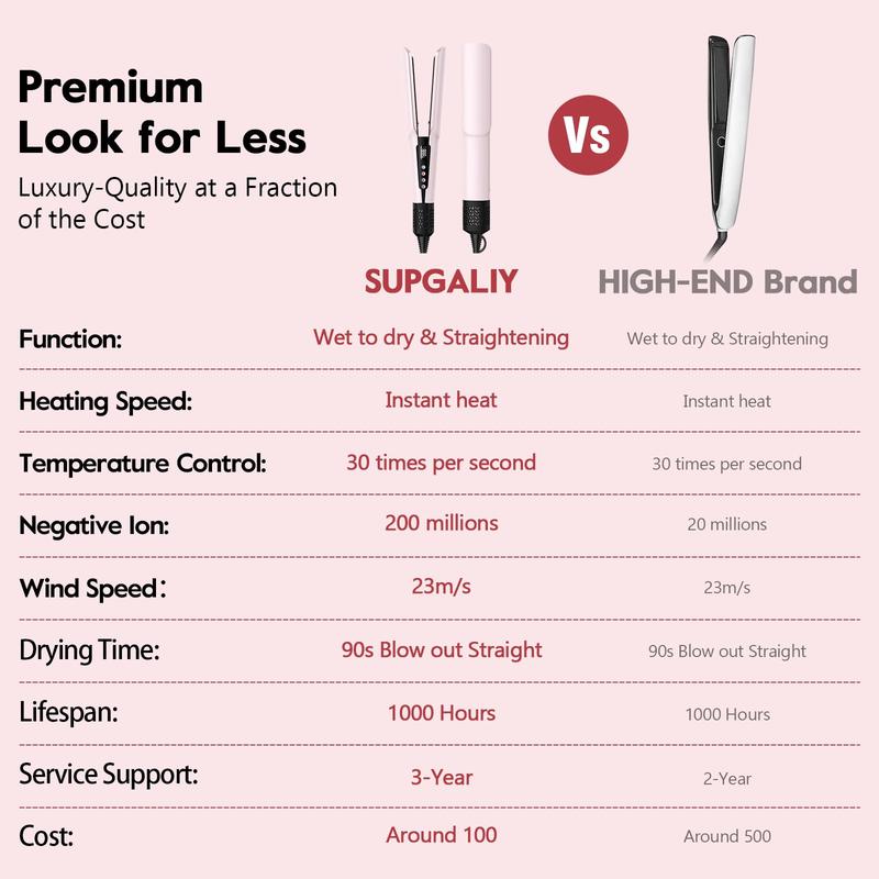 ·2 In 1 Straightener: 110,000 rpm high-speed motor, up to 23m/s air speed, Ultra fast enough for wet to dry and straightening hair simultaneous in one tool. Our advantage is lower-temperature, higher-speed ionic airflow straightening (the highest temperature of our straightener is 320 degrees, which is much lower than the 440 degrees of traditional straighteners. It straightens and protects the hair without damaging the protein structure of the hair). Helps you to achieve a straight and shiny style!