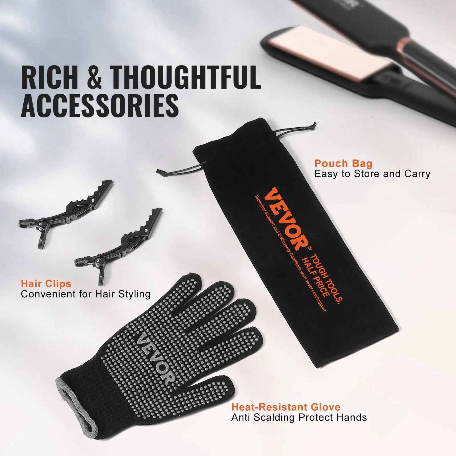 • Thoughtful Accessories: The included hair clips securely hold hair in place for quick and efficient styling, and the heat-resistant glove provides added protection for your hands. Additionally, the velvet pouch allows for convenient storage and portability, making it easy to take your hair straightener with you anywhere.